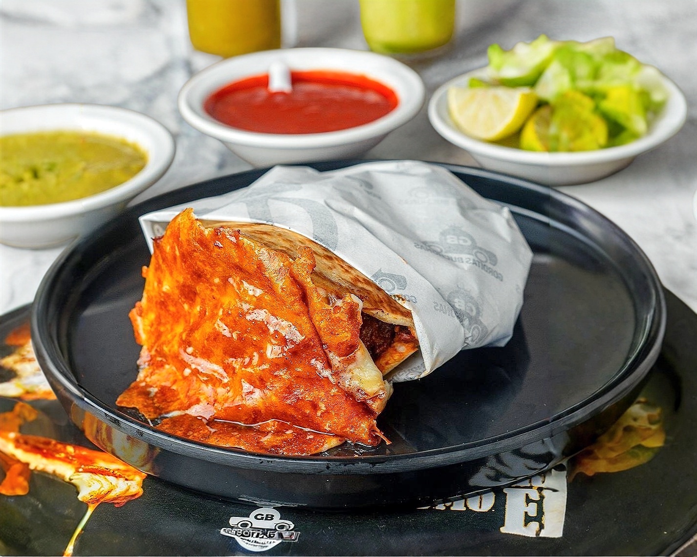 Riquisima gorda de birria con queso gratinado y costra de queso.
