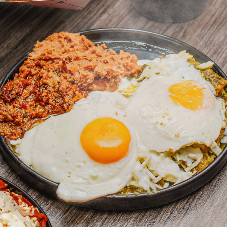 Chilaquiles en salsa verde acompañados de frijolitos y un huevito.