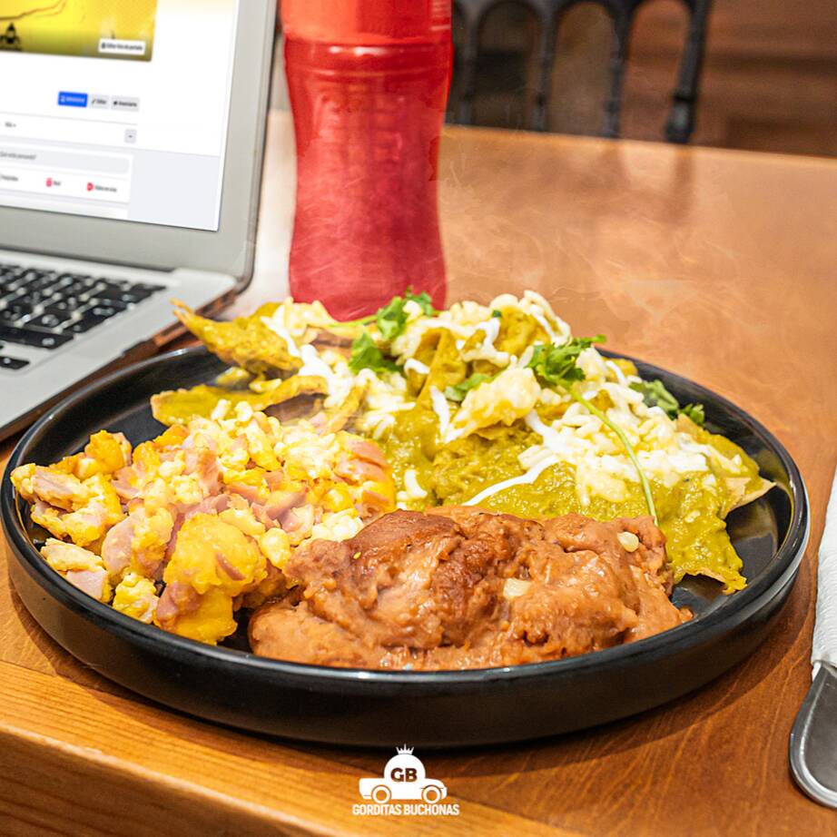 Chilaquiles en salsa verde acompañados de frijolitos y Guiso
