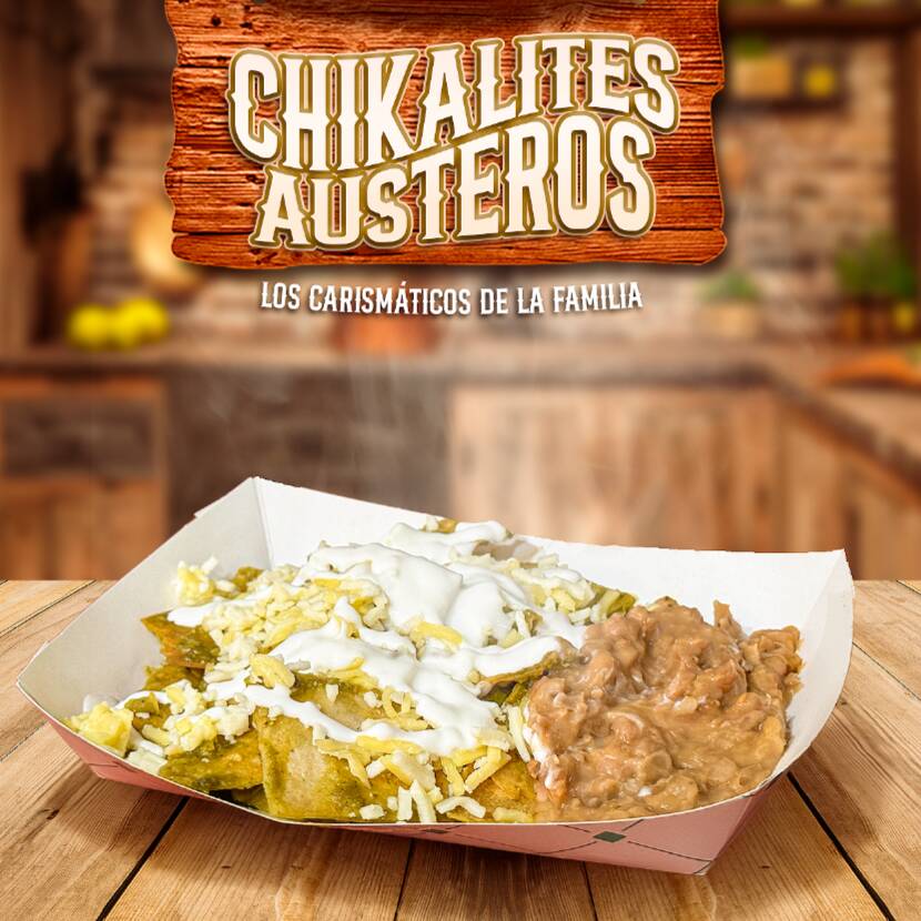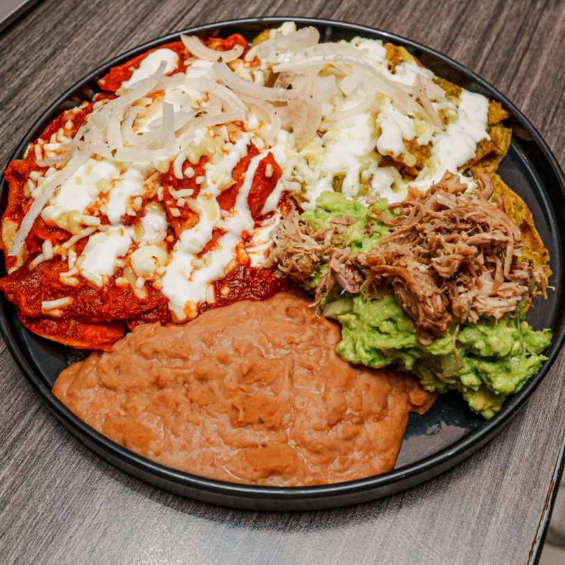 Chilaquiles en salsa verde acompañados de frijolitos y un Guiso a elegir