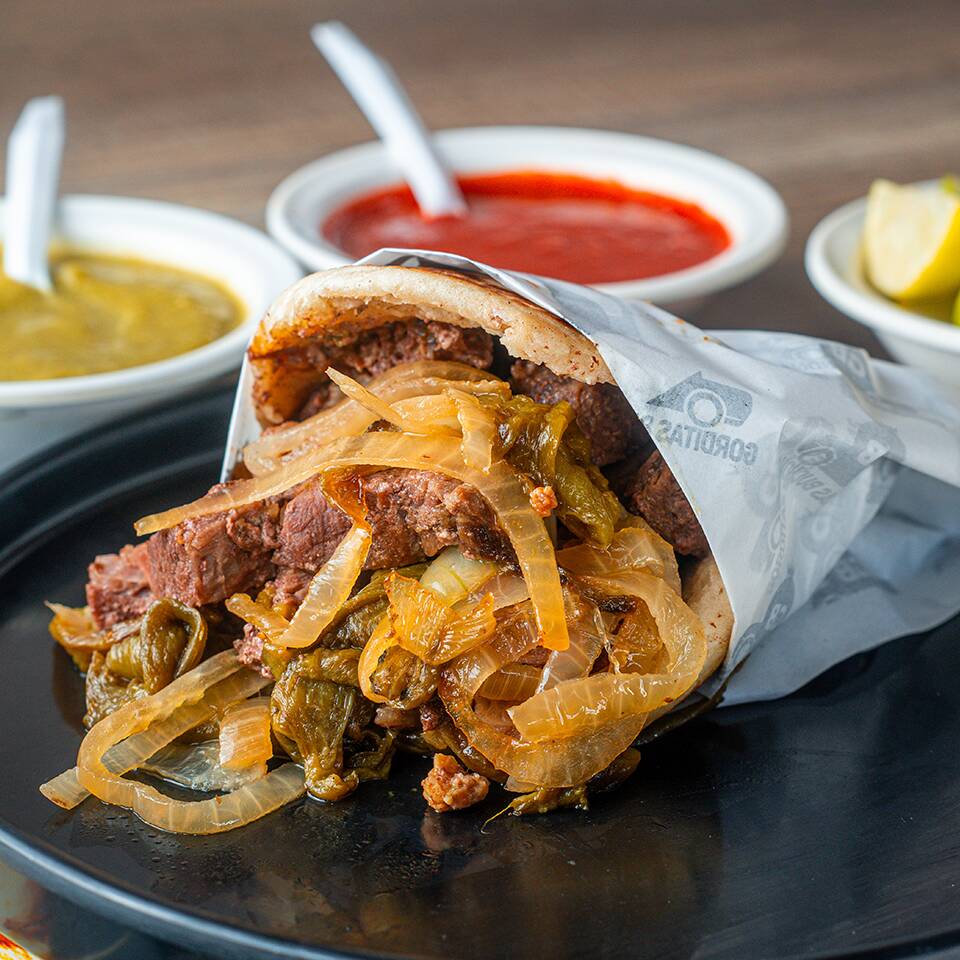 Gorda especial de carne asada jugosa, chilaca que pica pero sabroso y cebolla asada pa' darle el toque arremangado.