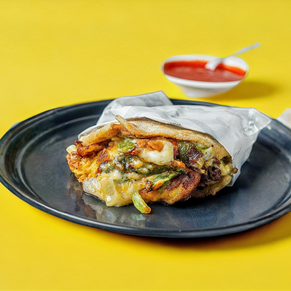 Gordita de frijoles con queso, tamaño aproximado de 14 cm. Elige entre masa de maíz o de harina y selecciona tu guiso favorito.