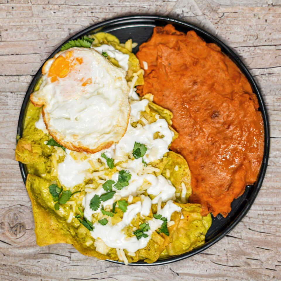 Chilaquiles en salsa verde, frijolitos y 1 huevito estrellado para acompañar.