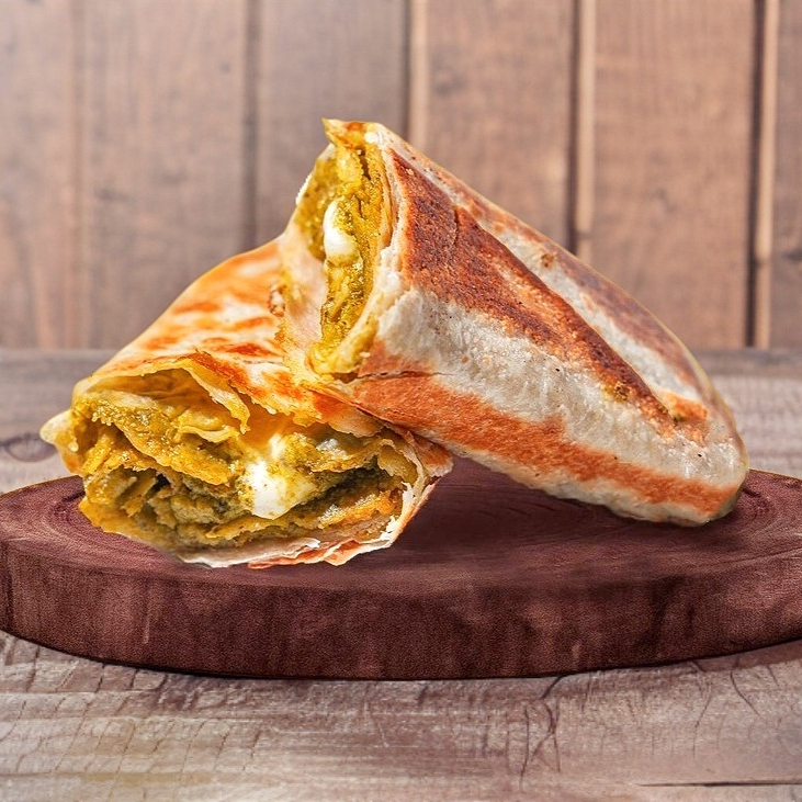 Burrito de chilaquil en salsa verde con una capa de frijoles, queso y crema.