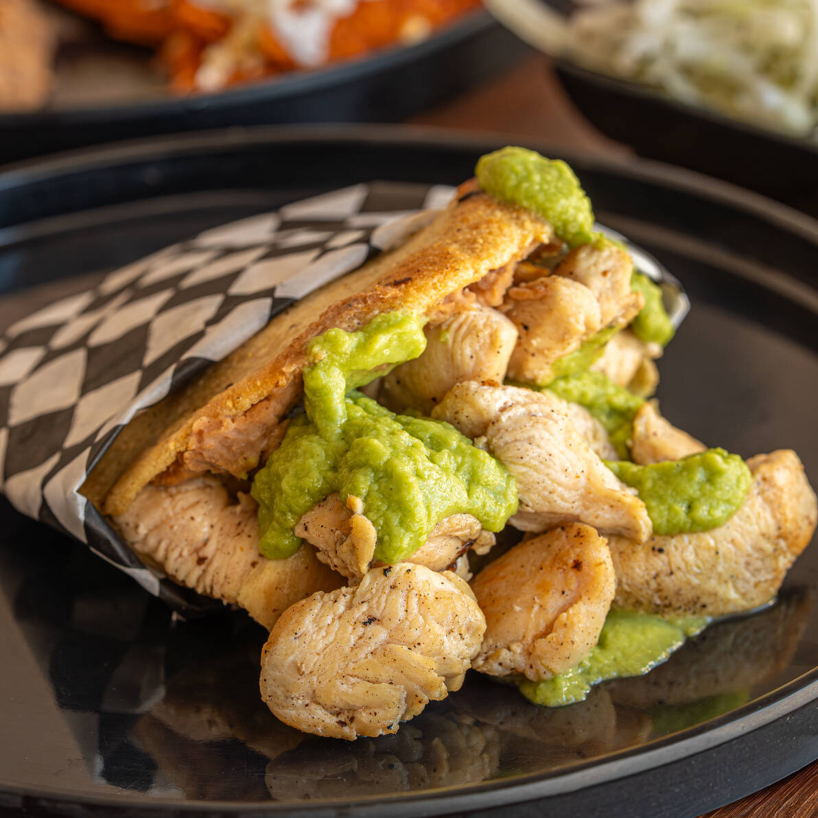 Gordita de pechuguita de pollo, con una capita de frijolitos refritos y con su salsita de aguacate.