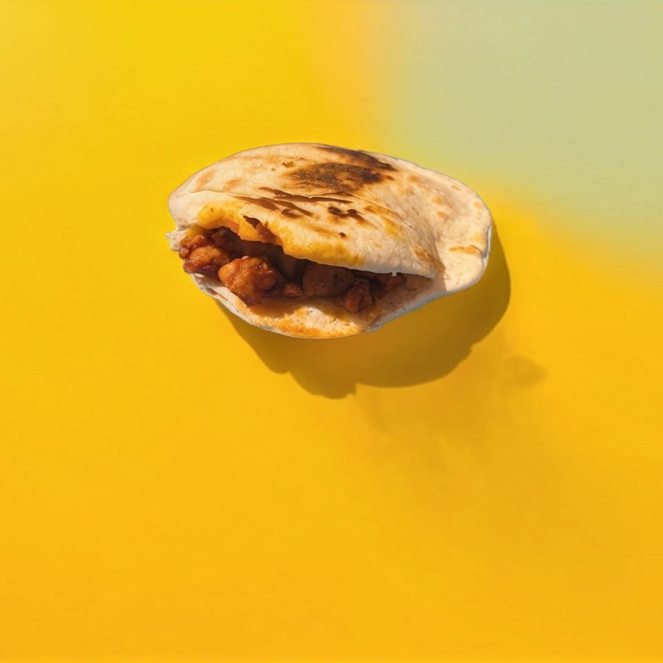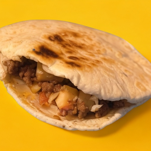 Gordita de harina con picadillo, carne molida, papas, cebolla y tomate