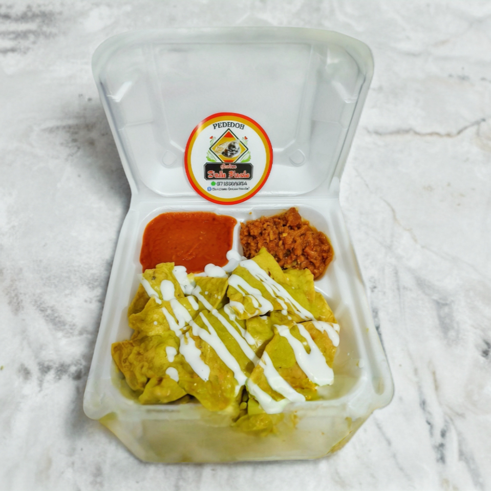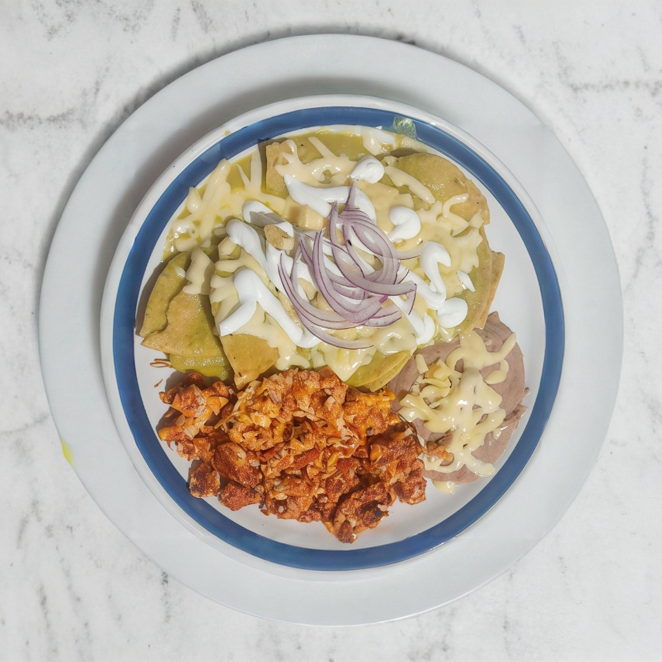 Totopos bañados en salsa verde, acompañados de un guiso a elegir, crema, cebolla, queso y frijoles