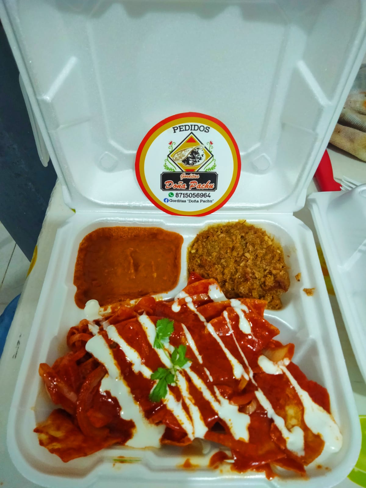 Totopos bañados en salsa roja, acompañados de un guiso a elegir, crema, cebolla, queso y frijoles.
