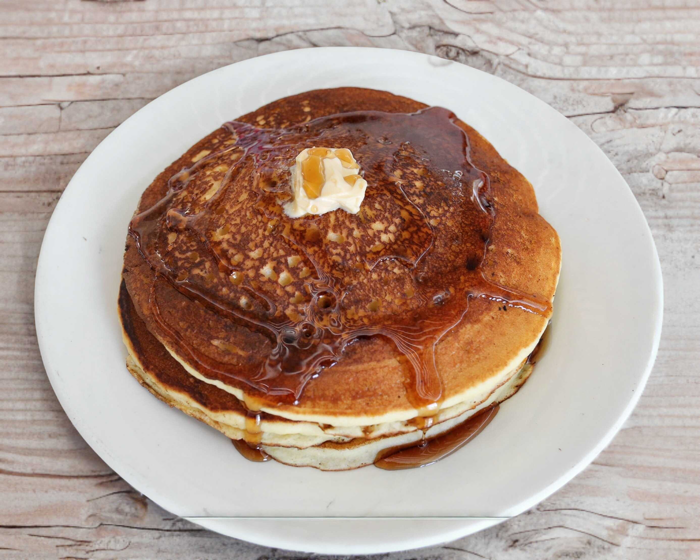 3 piezas medianas de hot cakes. Se sirven acompañados con un topping a elegir