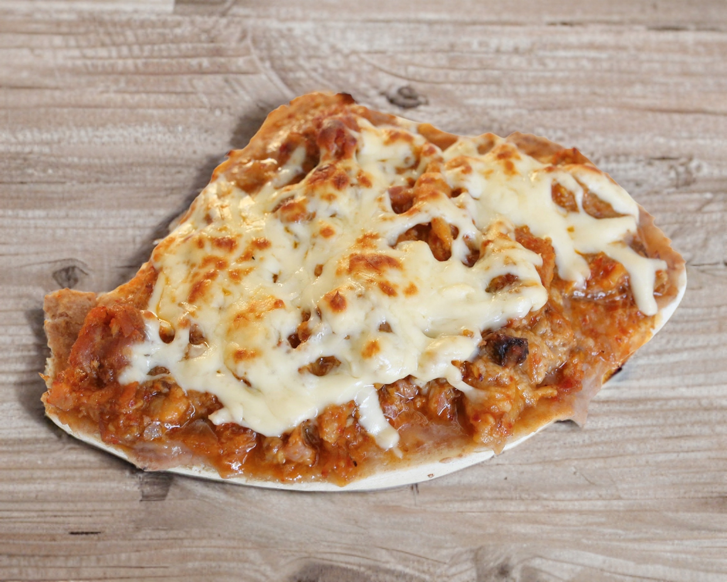 Medio pan fránces con frijoles y queso gratinado, al horno.