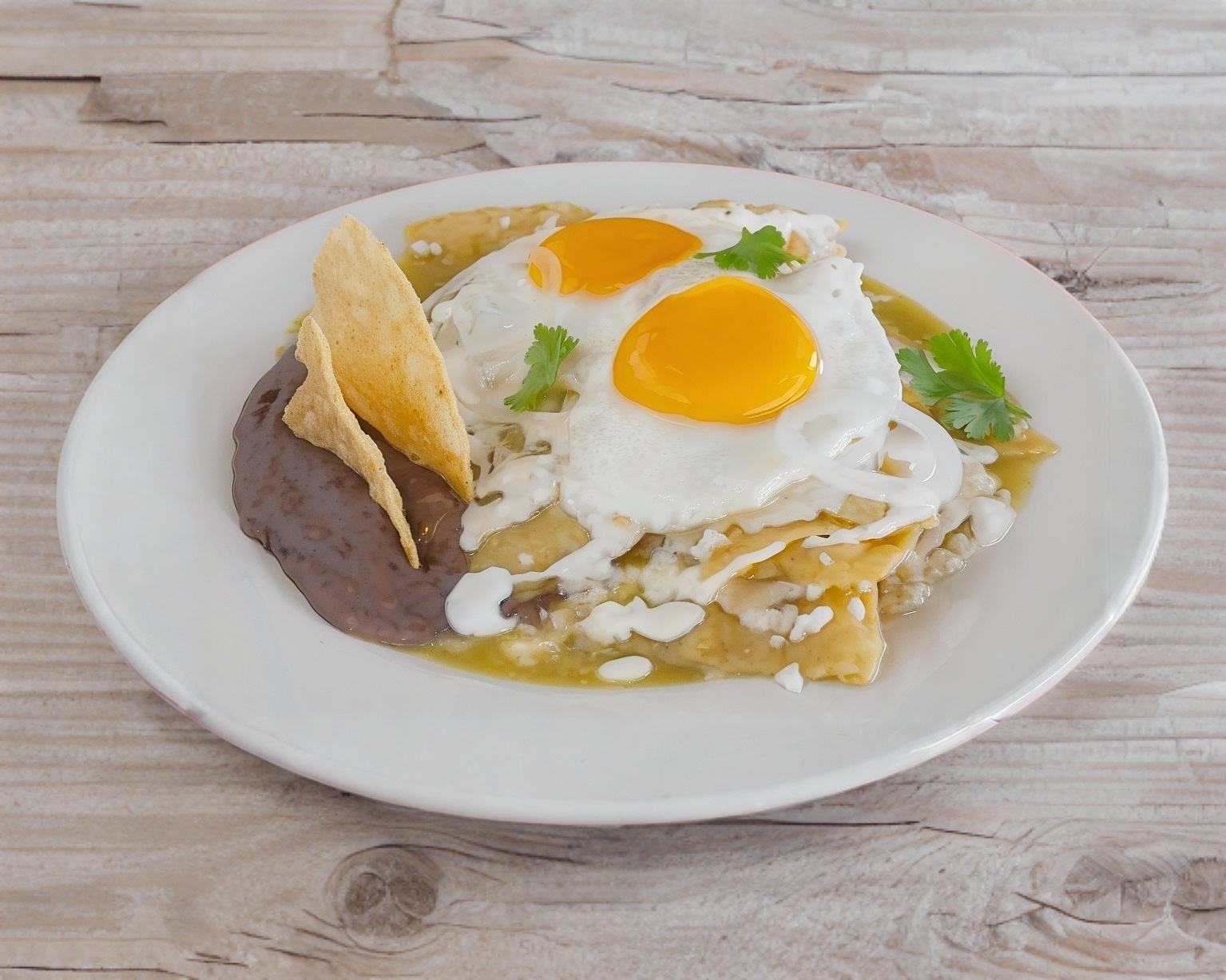 2 huevos estrellados montados en una cama de chilaquiles verdes, acompañado de frijoles con queso y un guisado a elegir. Se sirven acompañados de 2 piezas de tortilla a elegir: harina o maíz.
