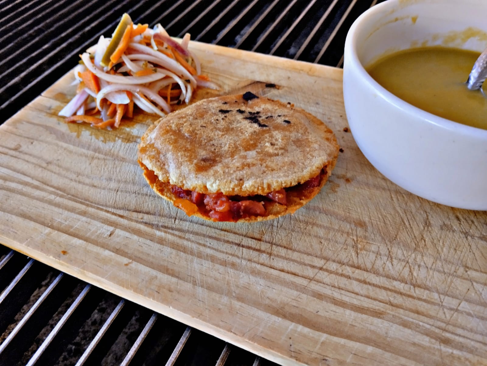 Gordita de maíz asada al carbón, rellena de queso y chorizo guisado con jalapeño y cebolla.