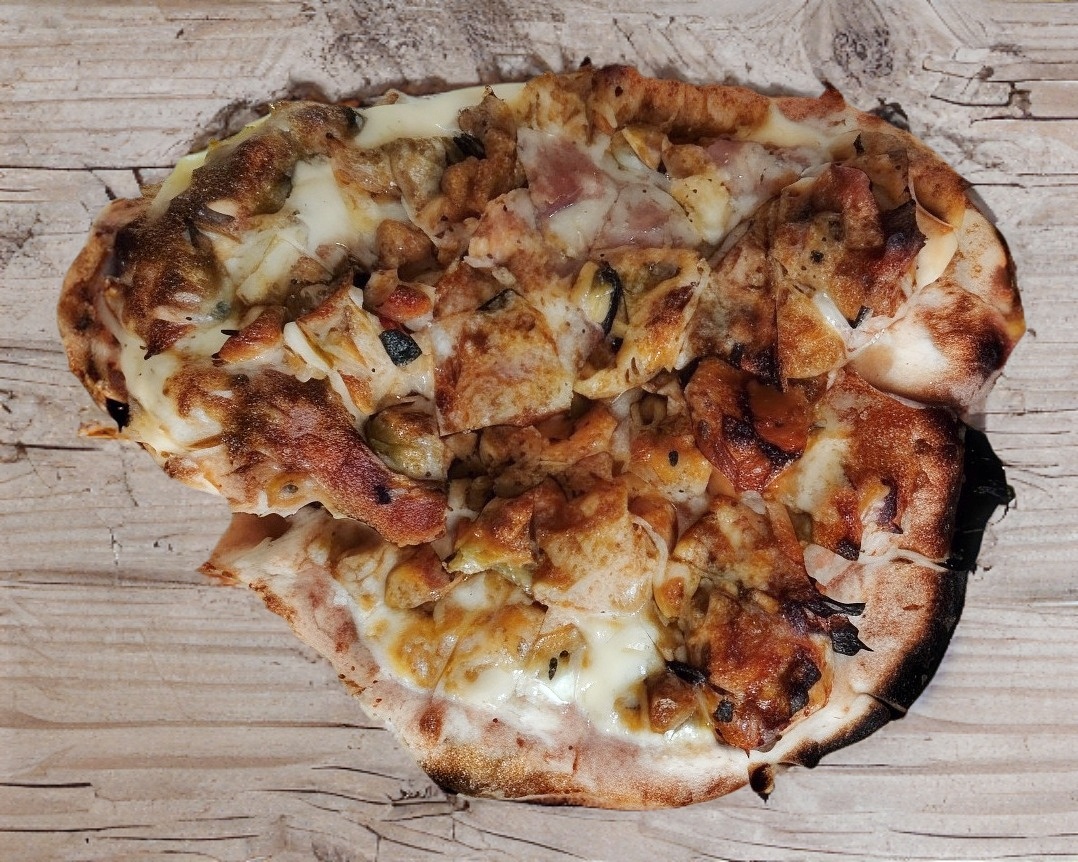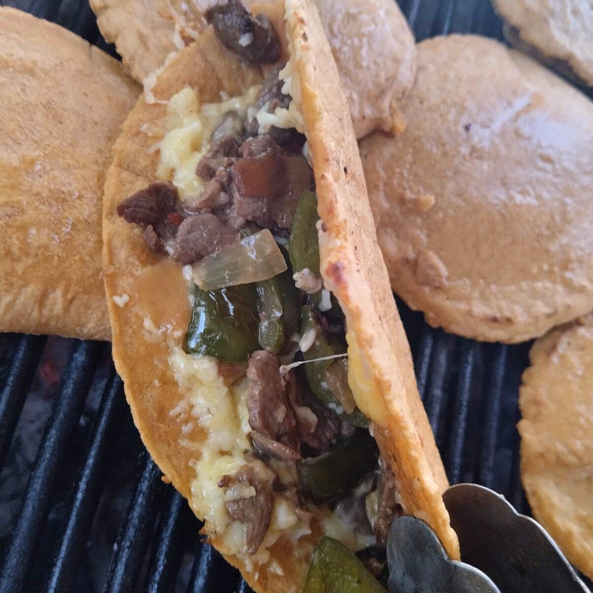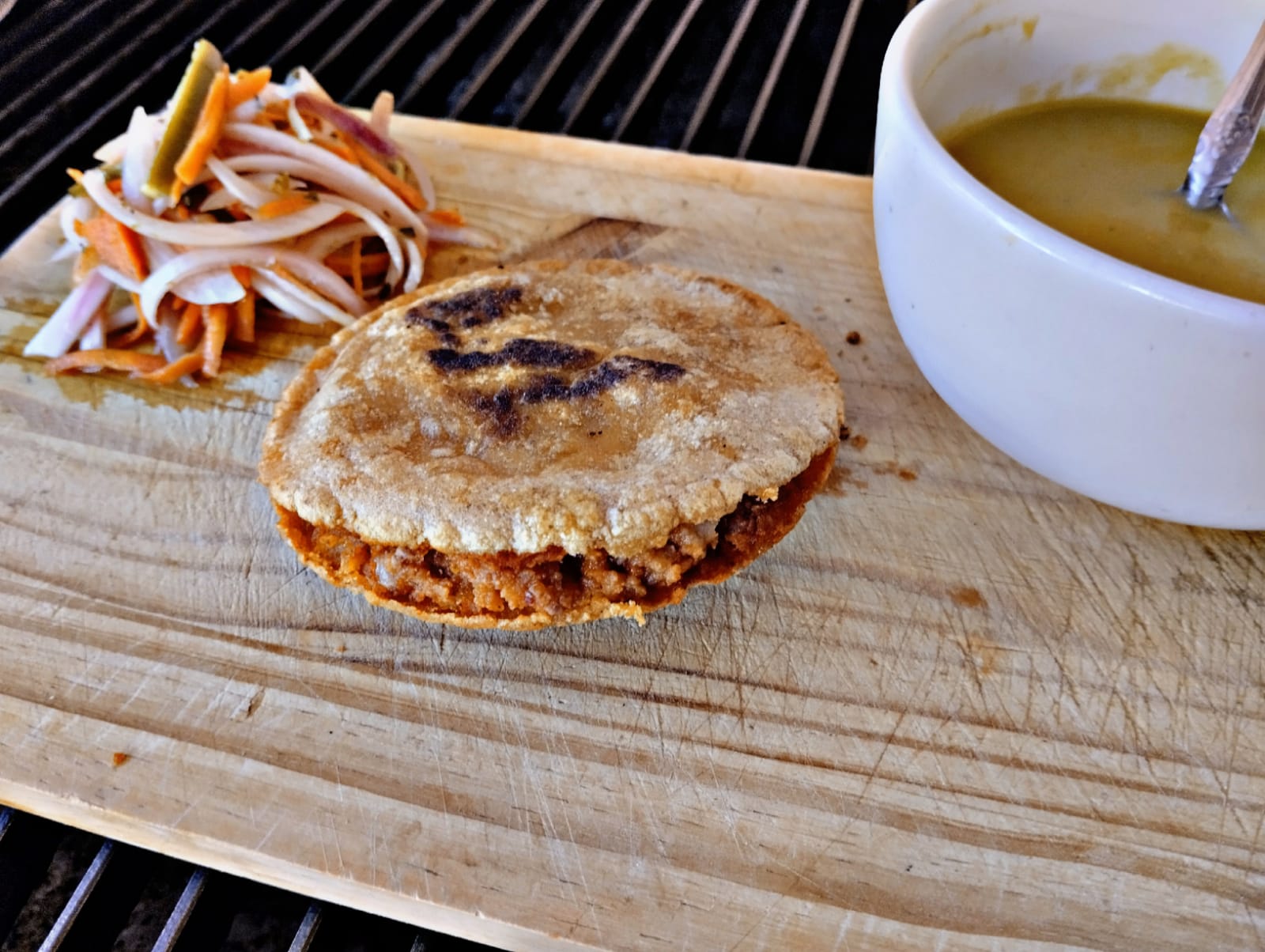 Gordita de maíz asada al carbón, rellena de discada (carne de res, carne de cerdo, chorizo, tocino, cebolla, salchicha y pimiento).