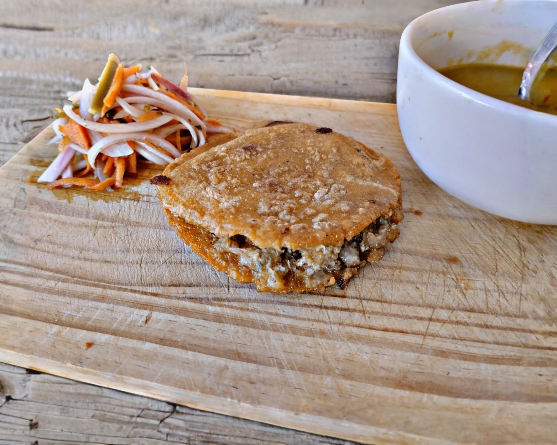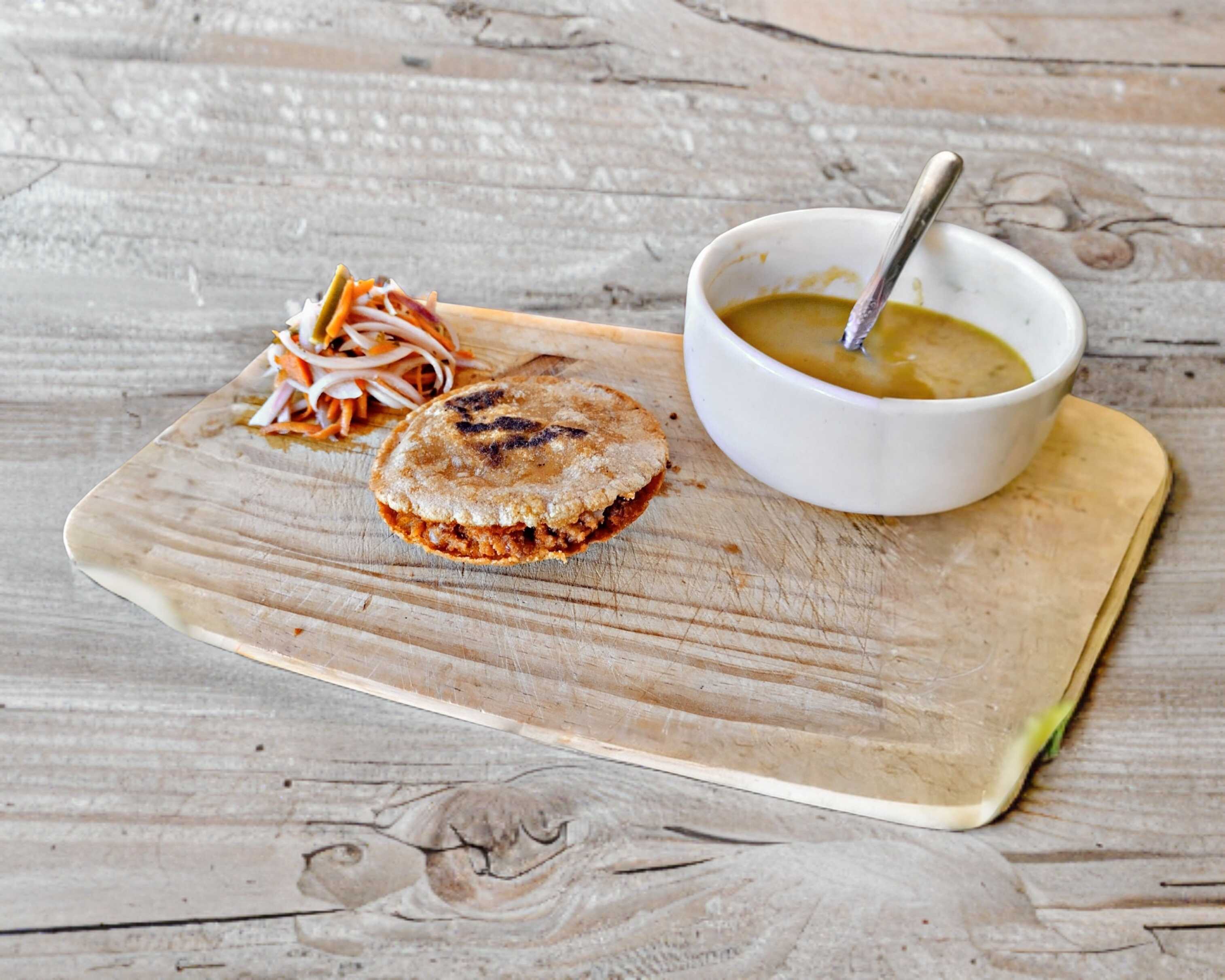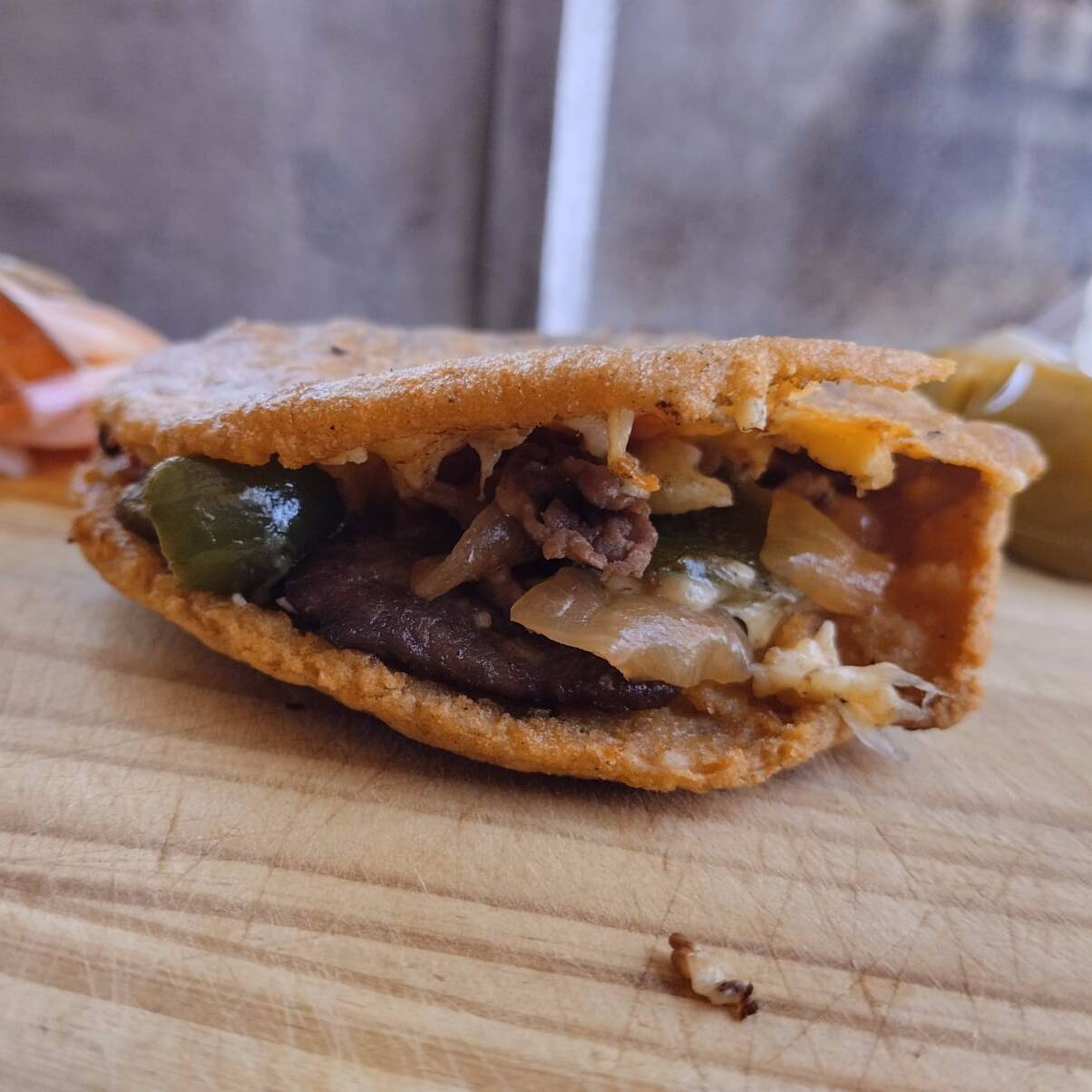 Gordita de maíz rellena de milanesa de res guisada con pimiento morrón y cebolla, con queso.