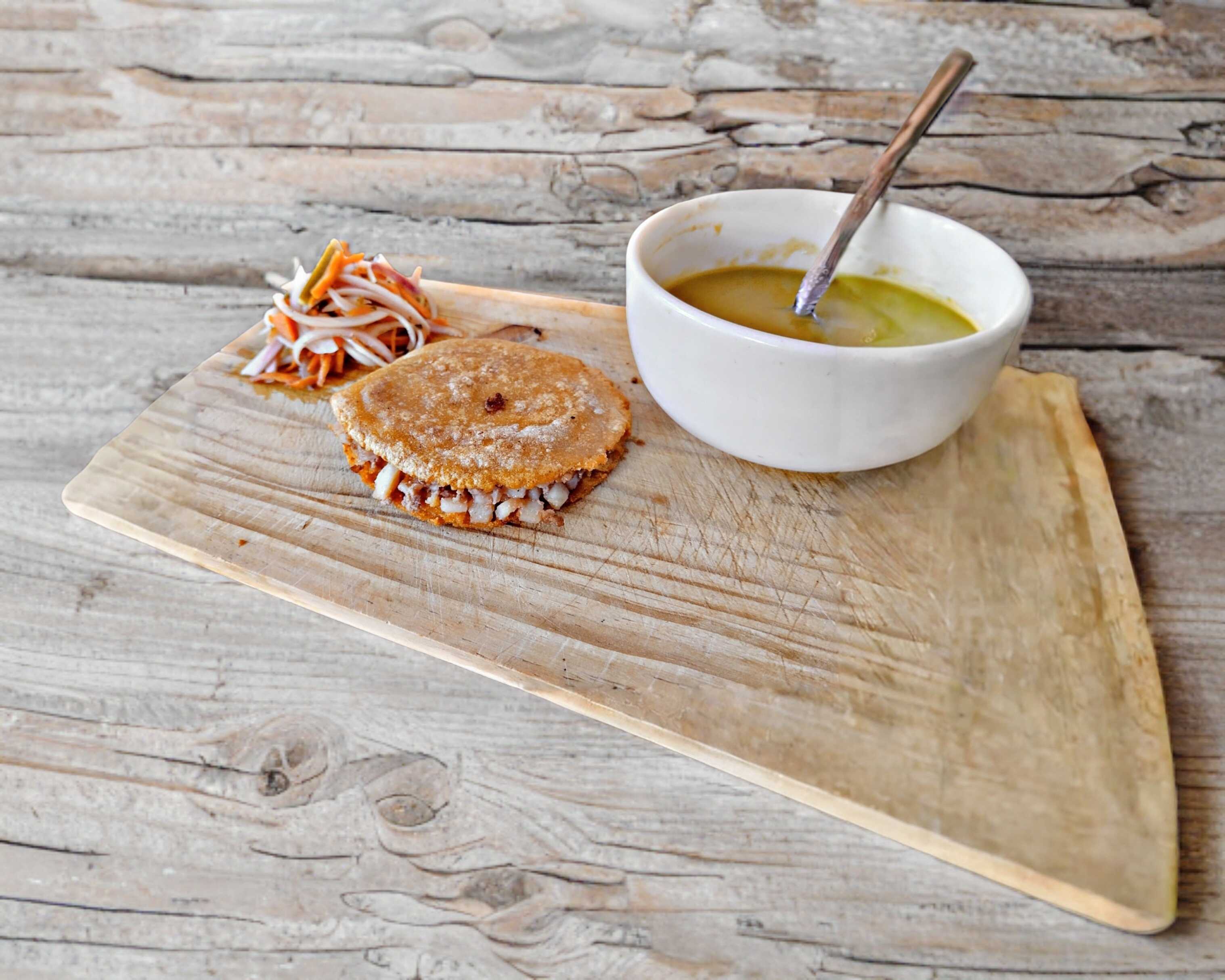 Gordita de maíz asada al carbón, rellena de chicharrón en salsa verde.