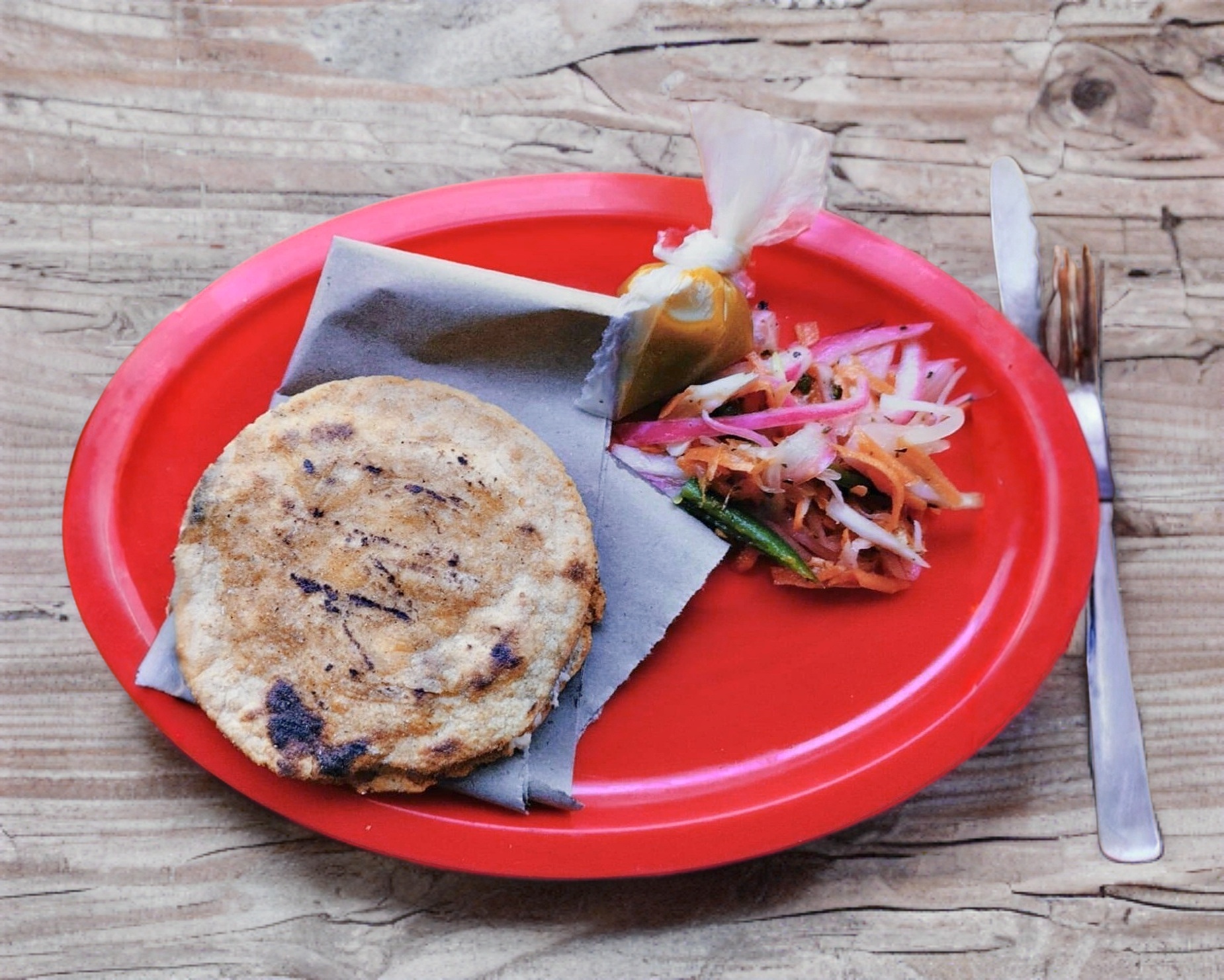 Tortilla de maíz rojo hecha a mano rellena de queso y chicharrón.