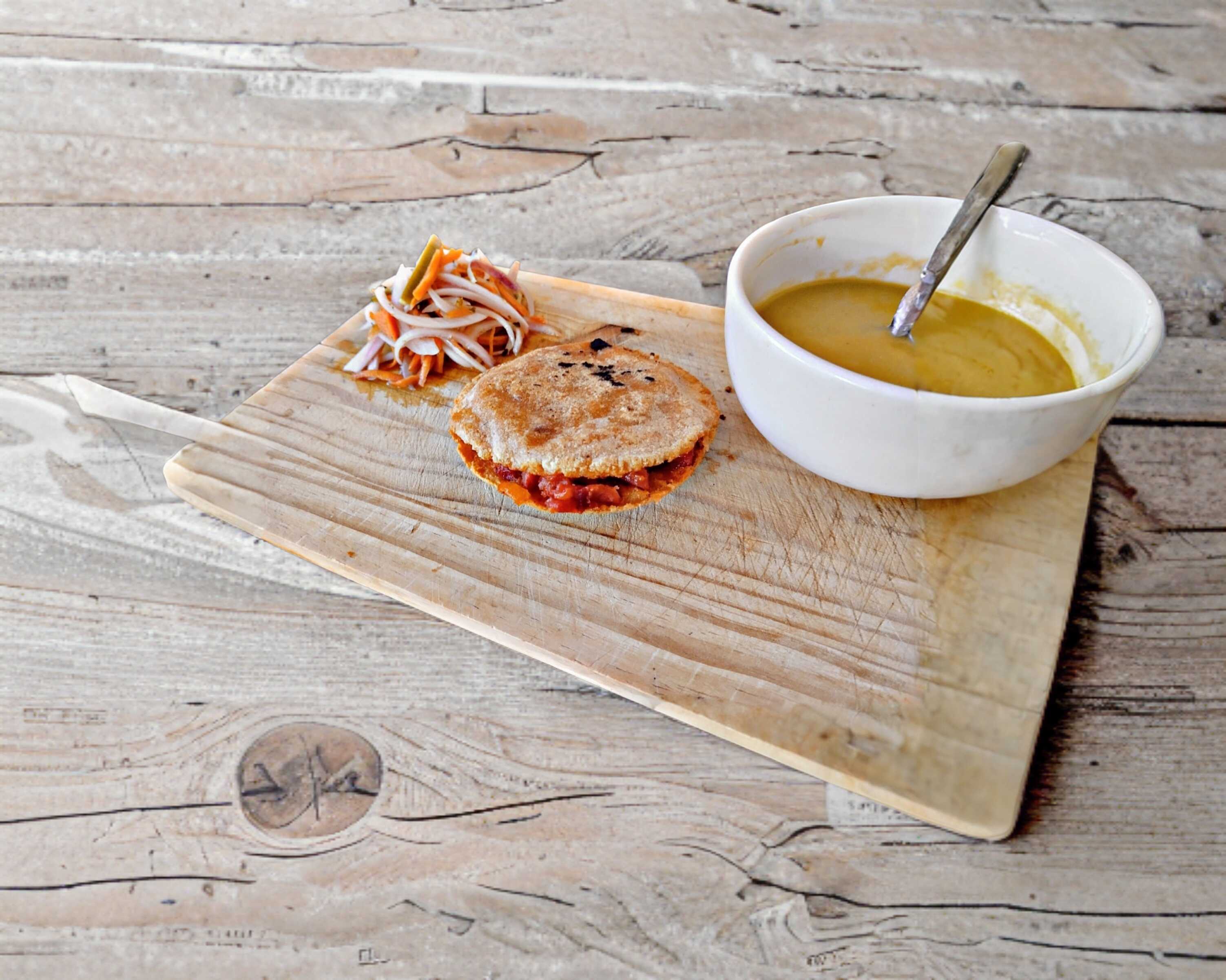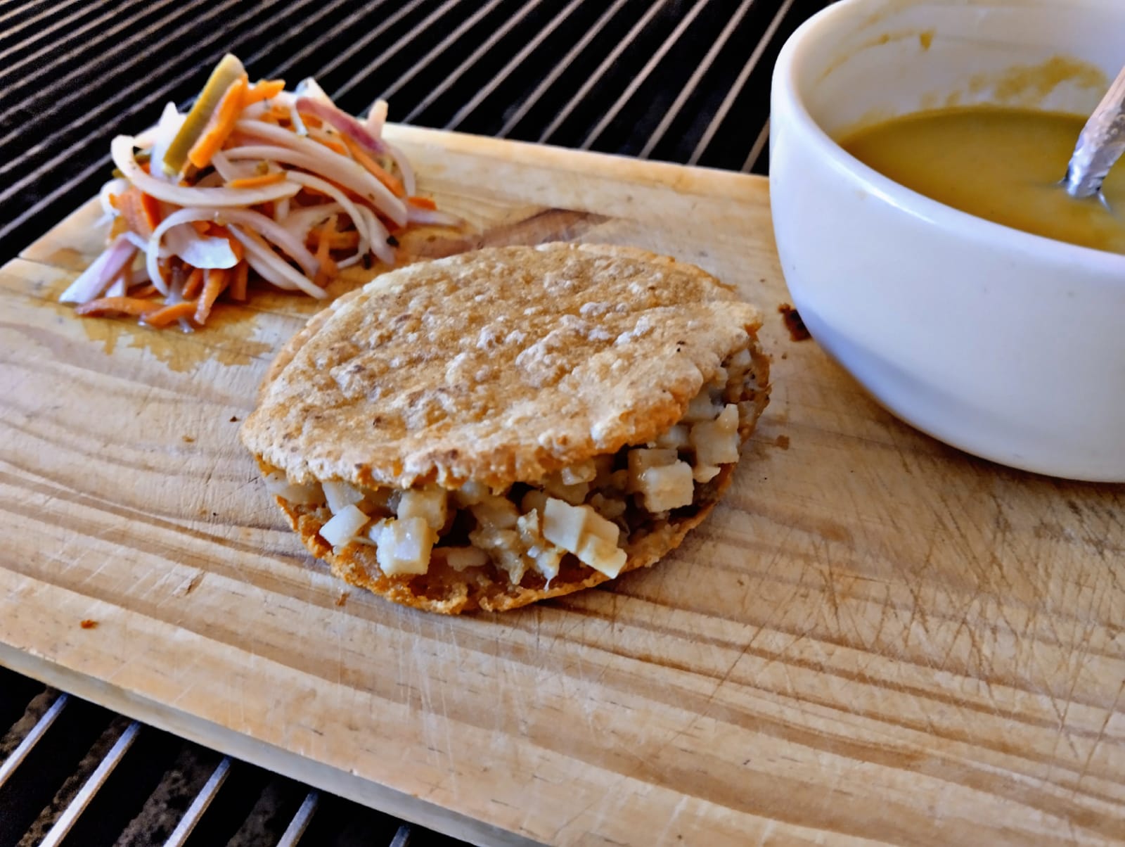 Gordita de maíz asada al carbón, rellena de picadillo (carne molida de res con zanahoria, papa y chícharos).
