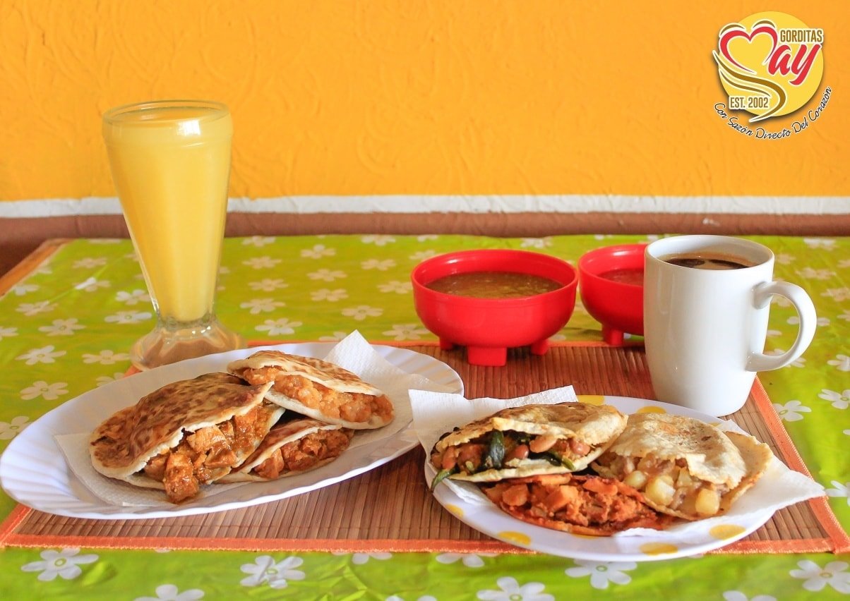 2 gorditas de papas verdes, 2 de papas rojas, 2 de frijoles con queso y 2 de chicharron de pella