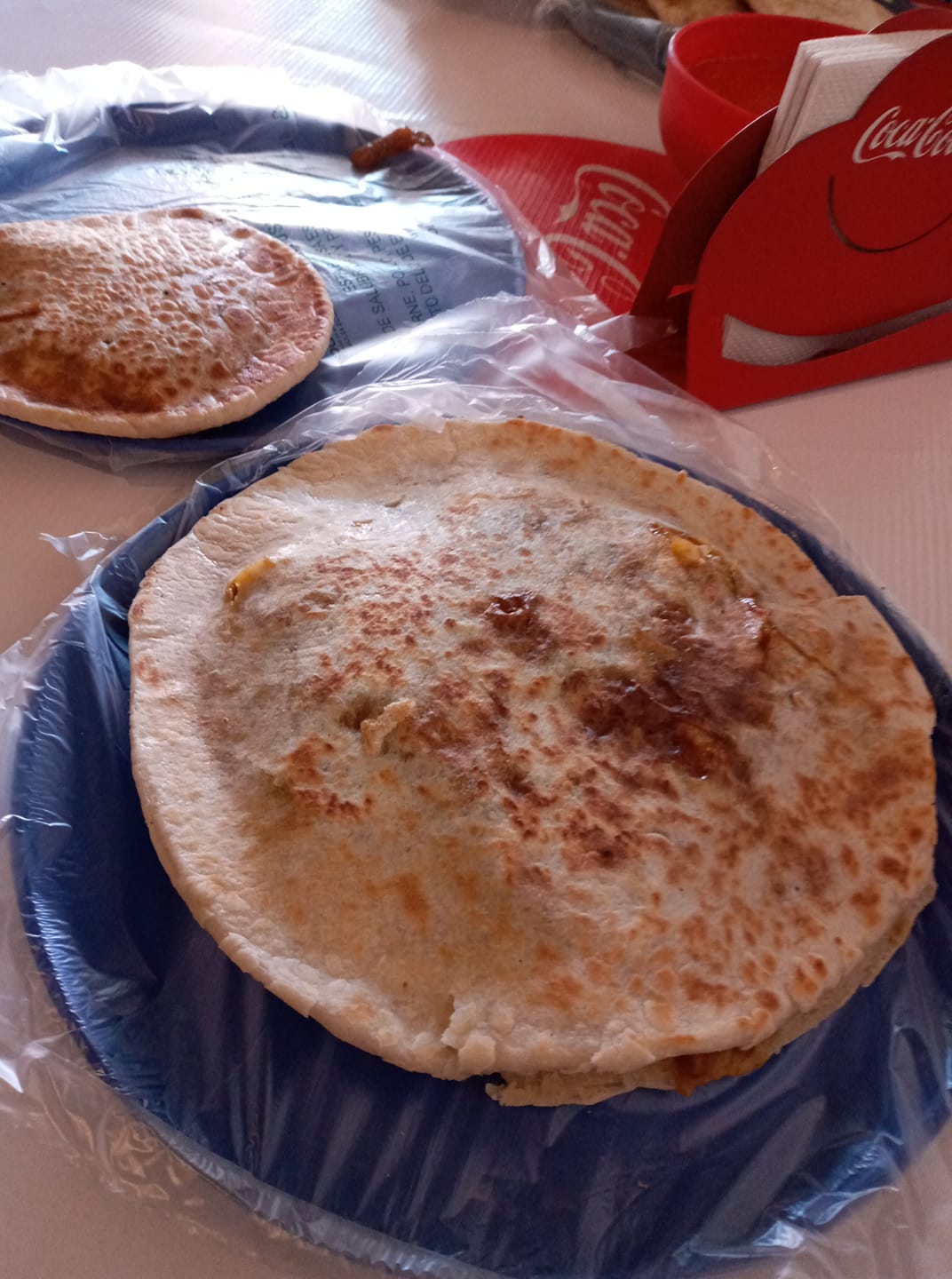 3 gorditas de harina, tamaño normal, 1 guiso a elegir, salsa verde y roja.
