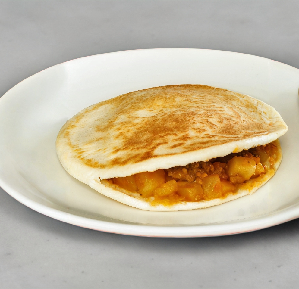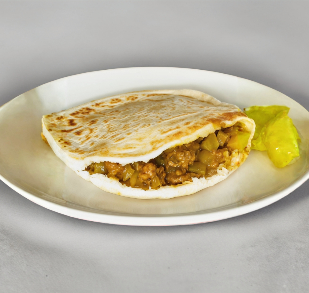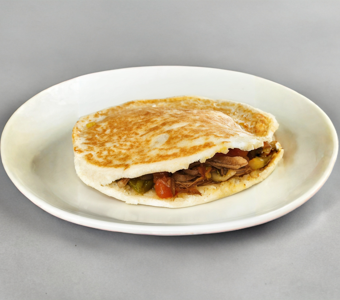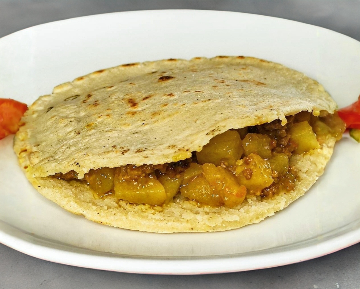 Gordita de harina rellena con picadillo de res en salsa de tomate con papas.