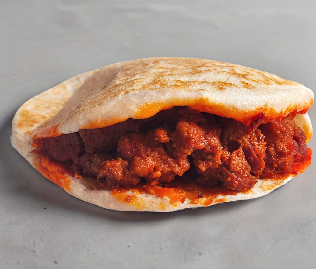 Gordita de harina rellena con carne de puerco en salsa roja para asado.