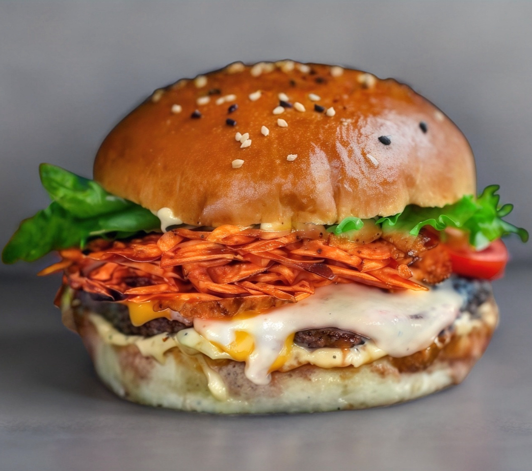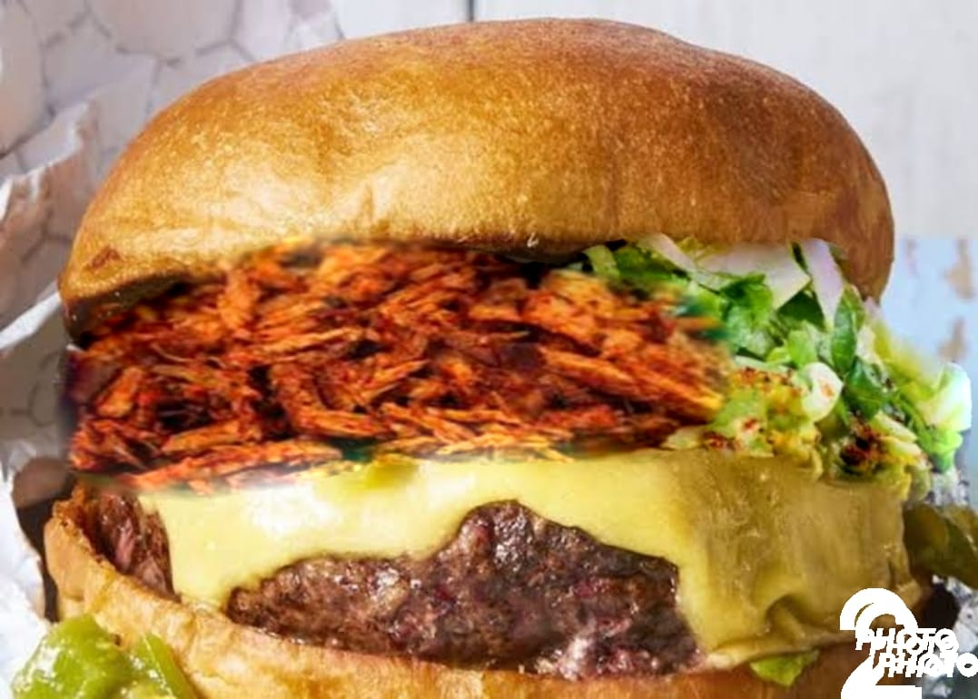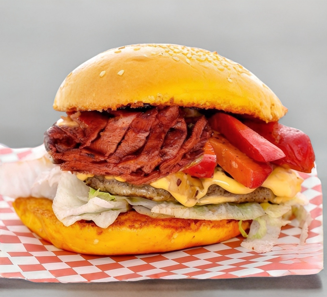 Carne al pastor y carne de res (120 g), queso blanco, tocino, aguacate, verduras frescas y aderezos – una combinación jugosa y llena de sabor, preparada con ingredientes frescos y de calidad.