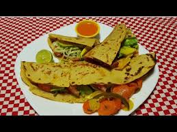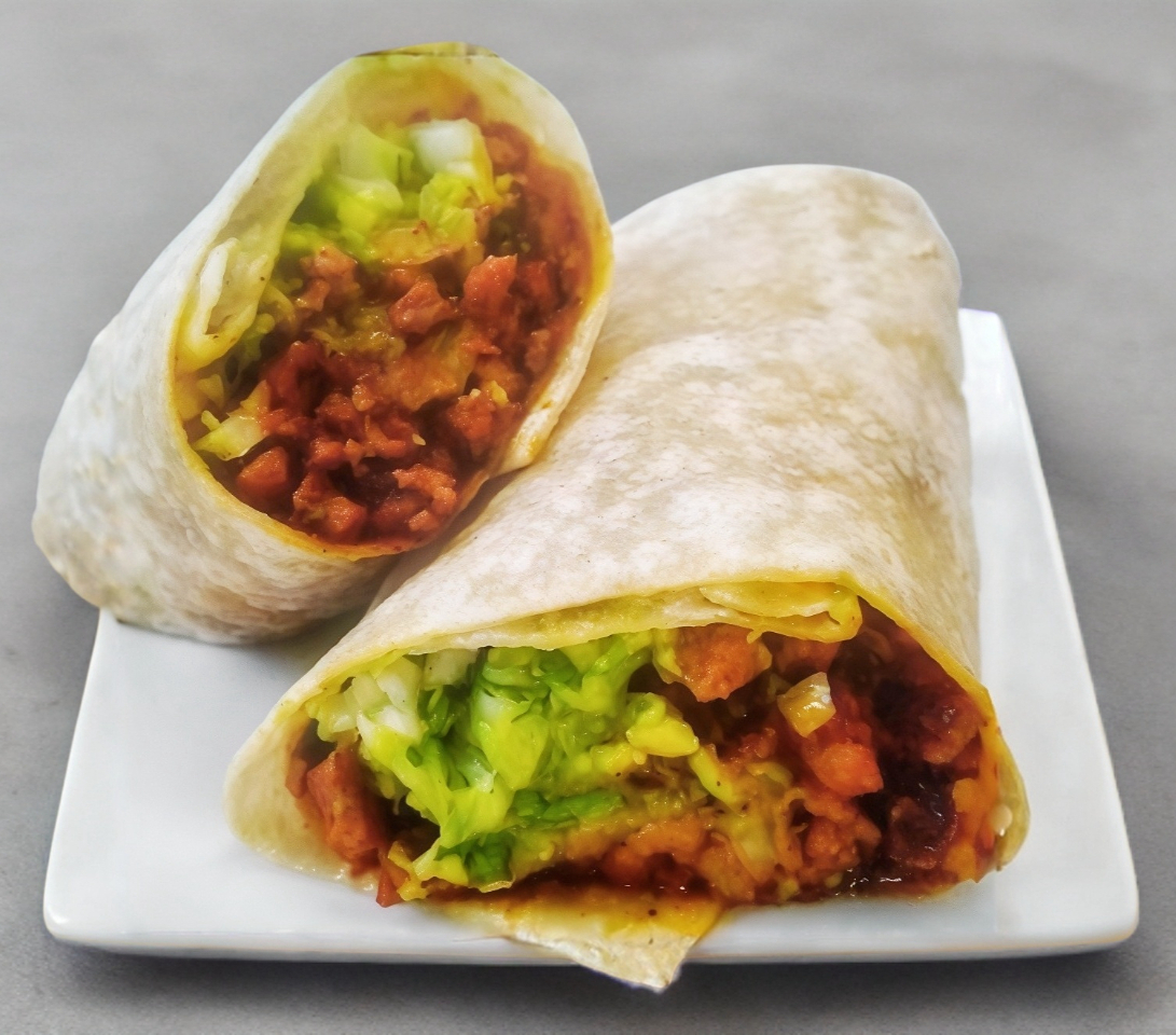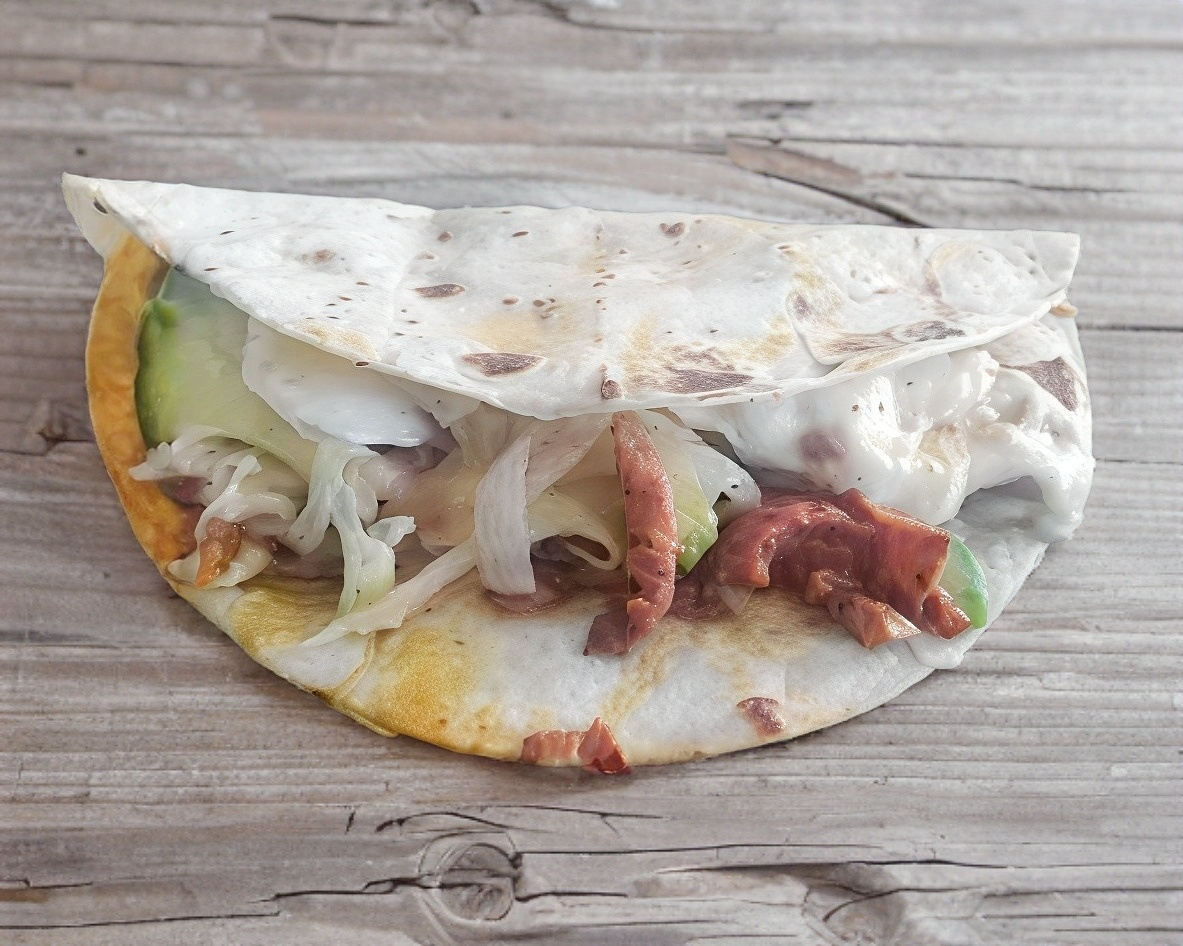 Tortilla arina carne adobada queso blanco aguacate verdura y su salsa