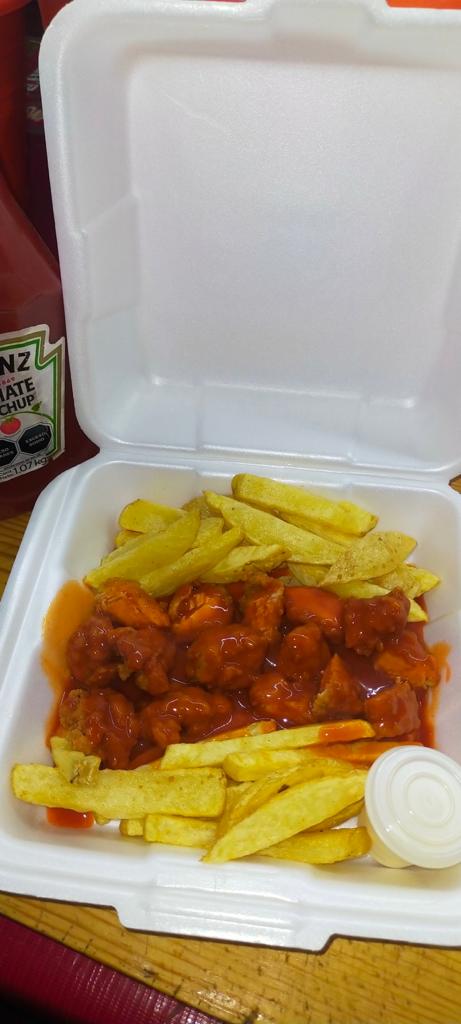 Salsa a elegir.(Mango Abanero, ) aderezo rach y papas ala francesa con aderezos