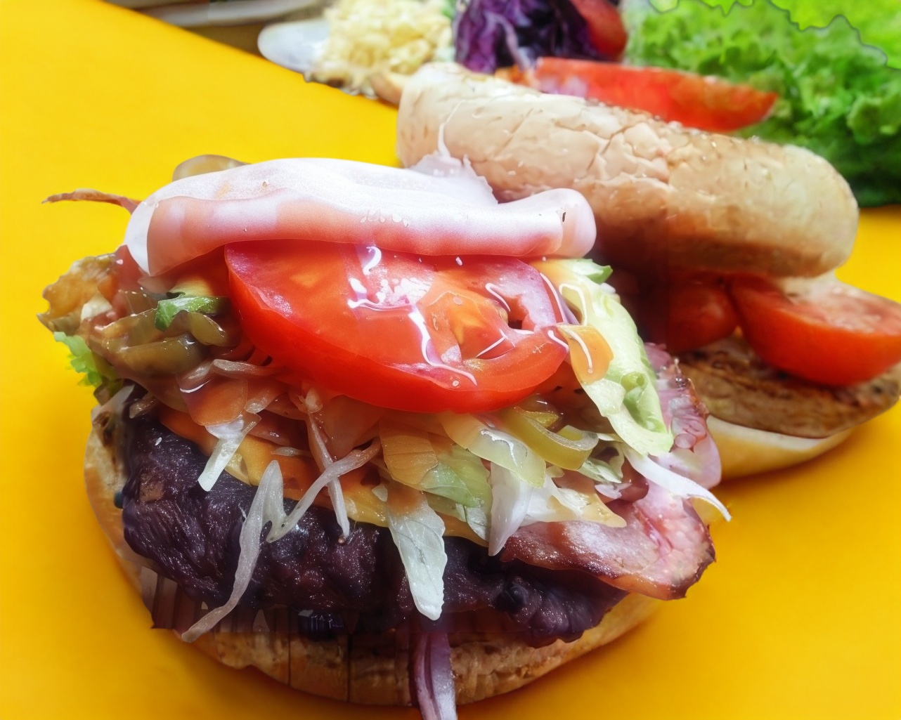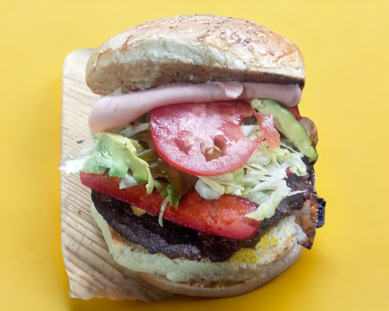 Pan grande,Carne de res 160 gms preparada (no congeladas), 160 gms de boneless, Queso amarillo ,Jamon, aguacate,cebolla sazonada,mayonesa y mostaza Mc Cormick, chiles curtidos, Catsup Heiz,Lechuga,Tomate.
