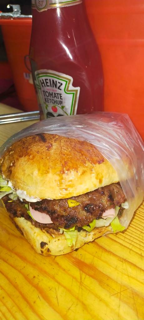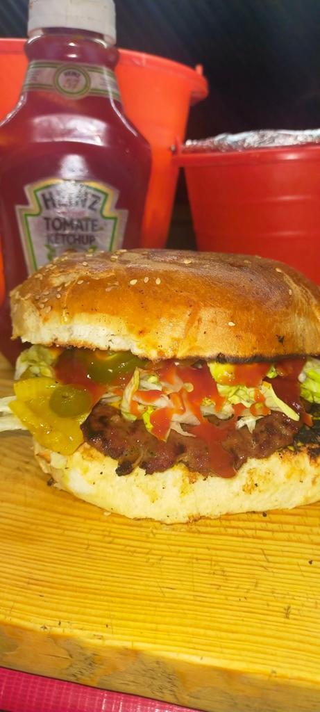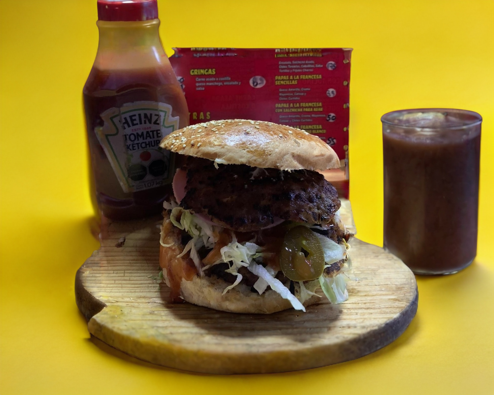 Pan grande,Carne de res 160 gms preparada (no congeladas), Salsa BBQ, Queso amarillo ,Jamon, aguacate,cebolla sazonada,mayonesa y mostaza Mc Cormick, chiles curtidos, Catsup Heiz,Lechuga,Tomate.