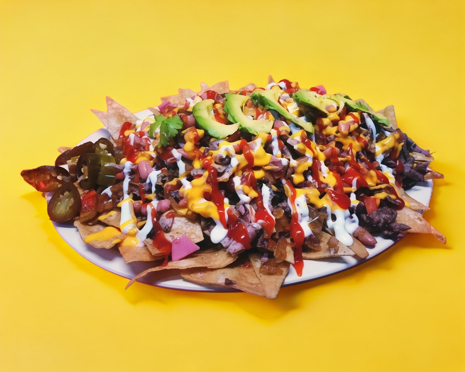 totopos dorados con 150 gms de carne asada, frijoles charros, tocino, queso amarillo,mayonesa,crema,catsup y chiles curtidos