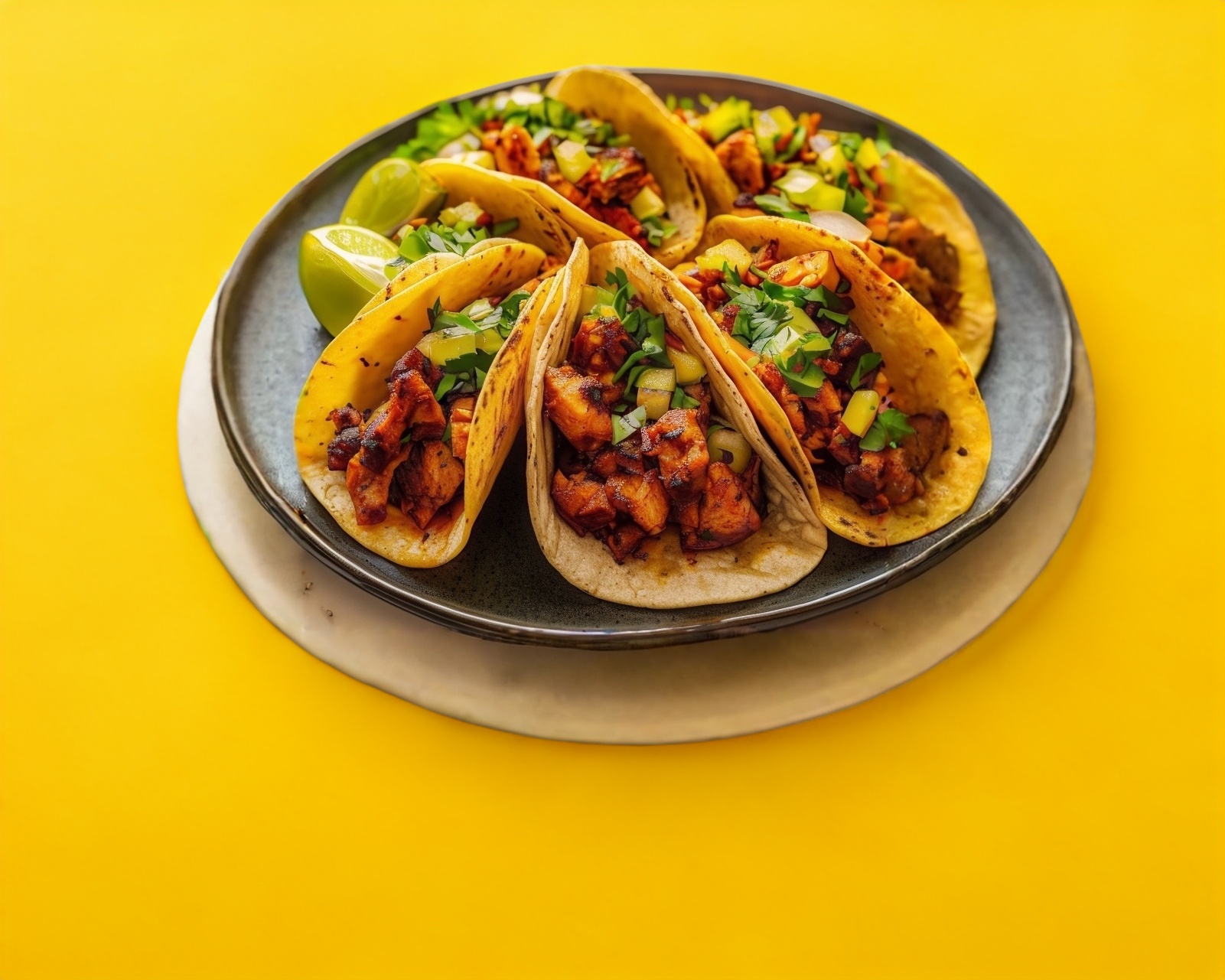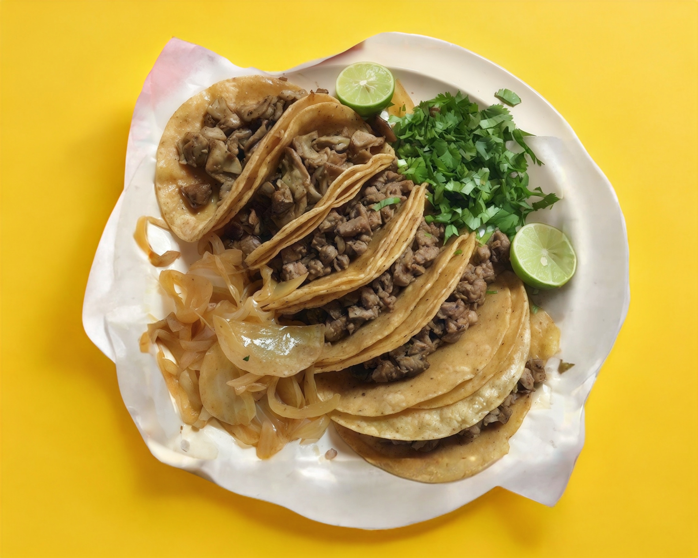 5 TACOS DE ADOBADA doble tortilla acompañados con Cebollita Sazonada, Cilantro, Limon y Salsa de