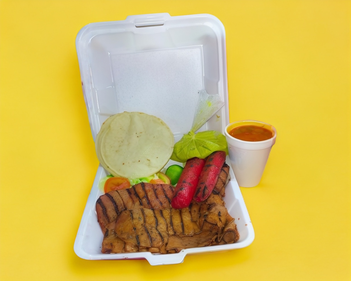costilla asada, salchicha, frijoles charros, ensalada, tortillas y salsa