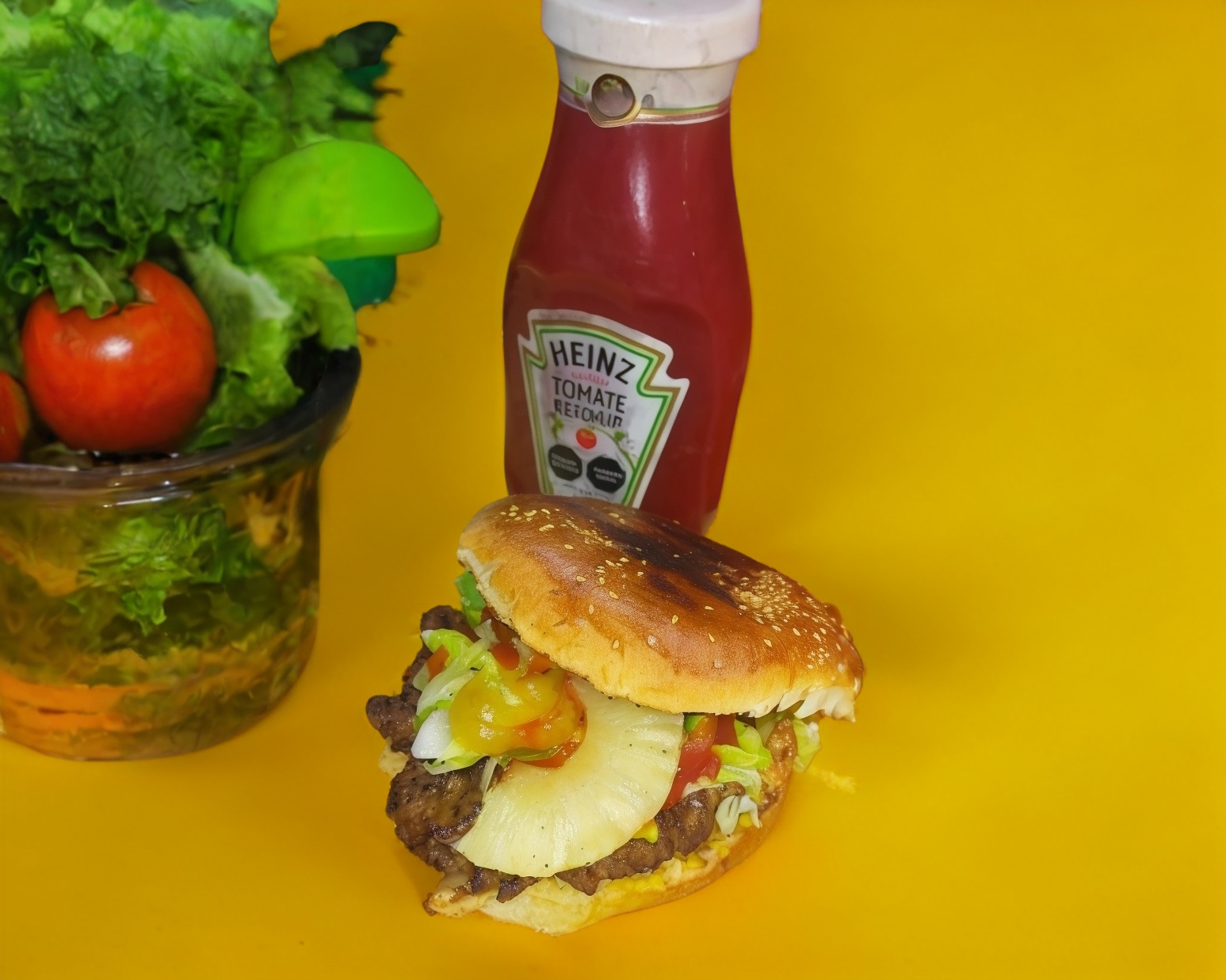 an grande, Carne de res 160gms preparadas (no congeladas), Piña, Queso amarillo ,Jamon, aguacate,cebolla sazonada,mayonesa y mostaza Mc Cormick, chiles curtidos, Catsup Heiz,Lechuga,Tomate.