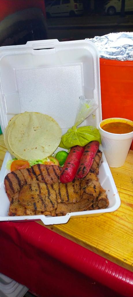 Costilla Asada Salsa Mango Abanero, salchicha, ensalada, frijoles charros, cebolla, tortillas , chiles toreados y salsa