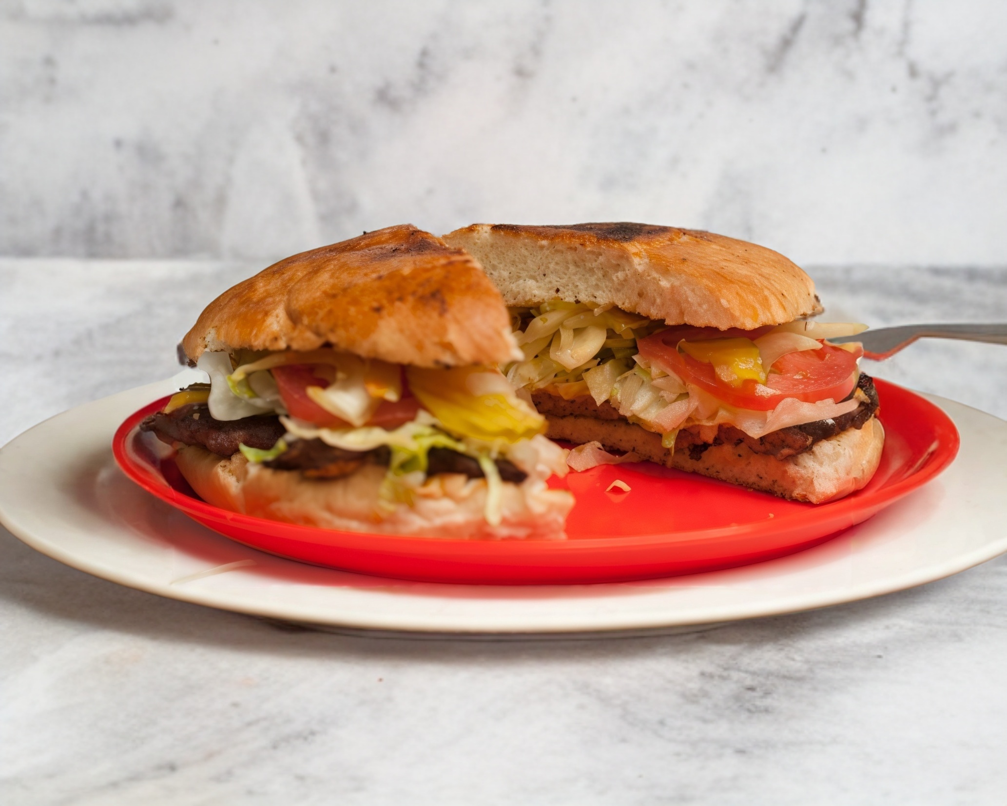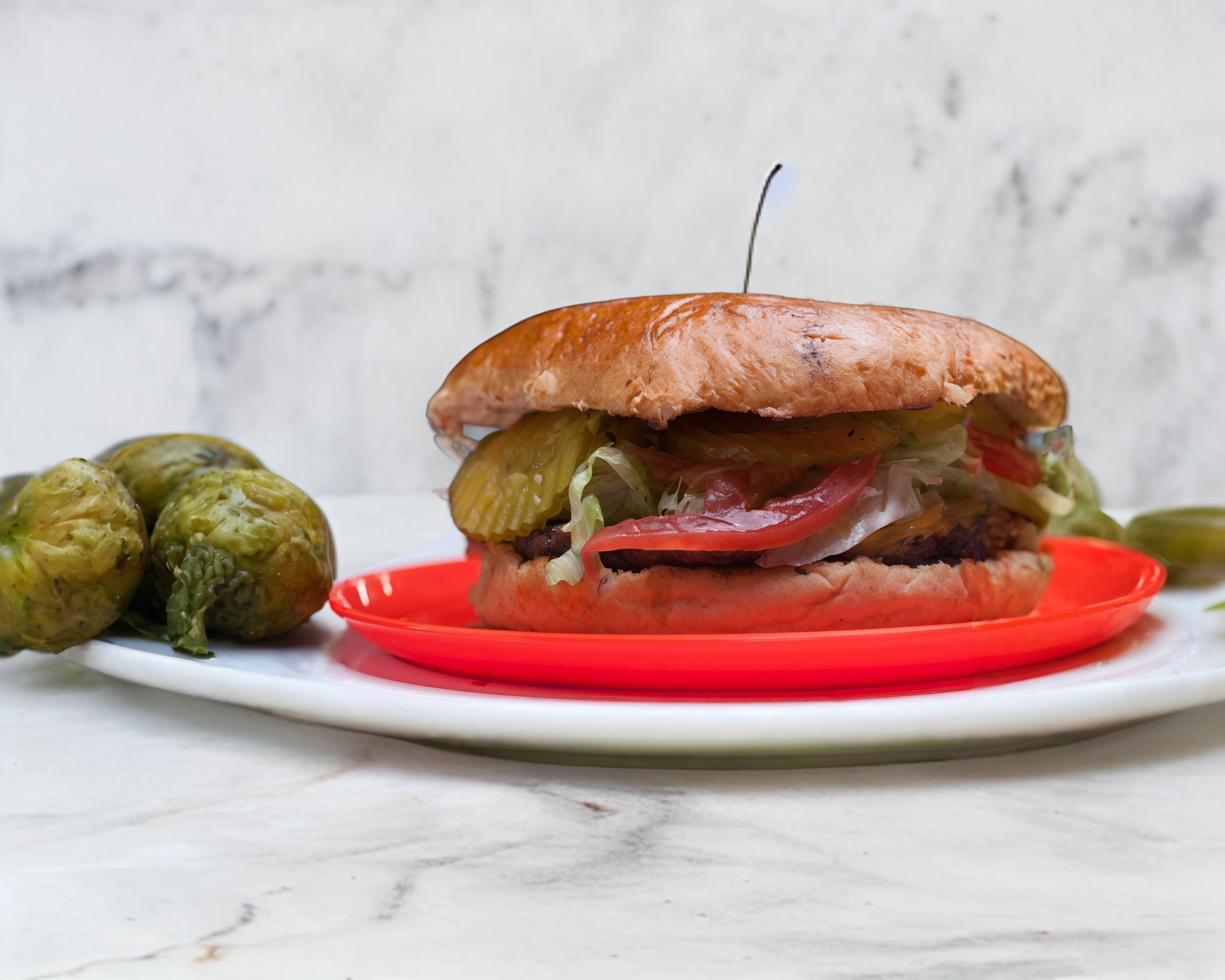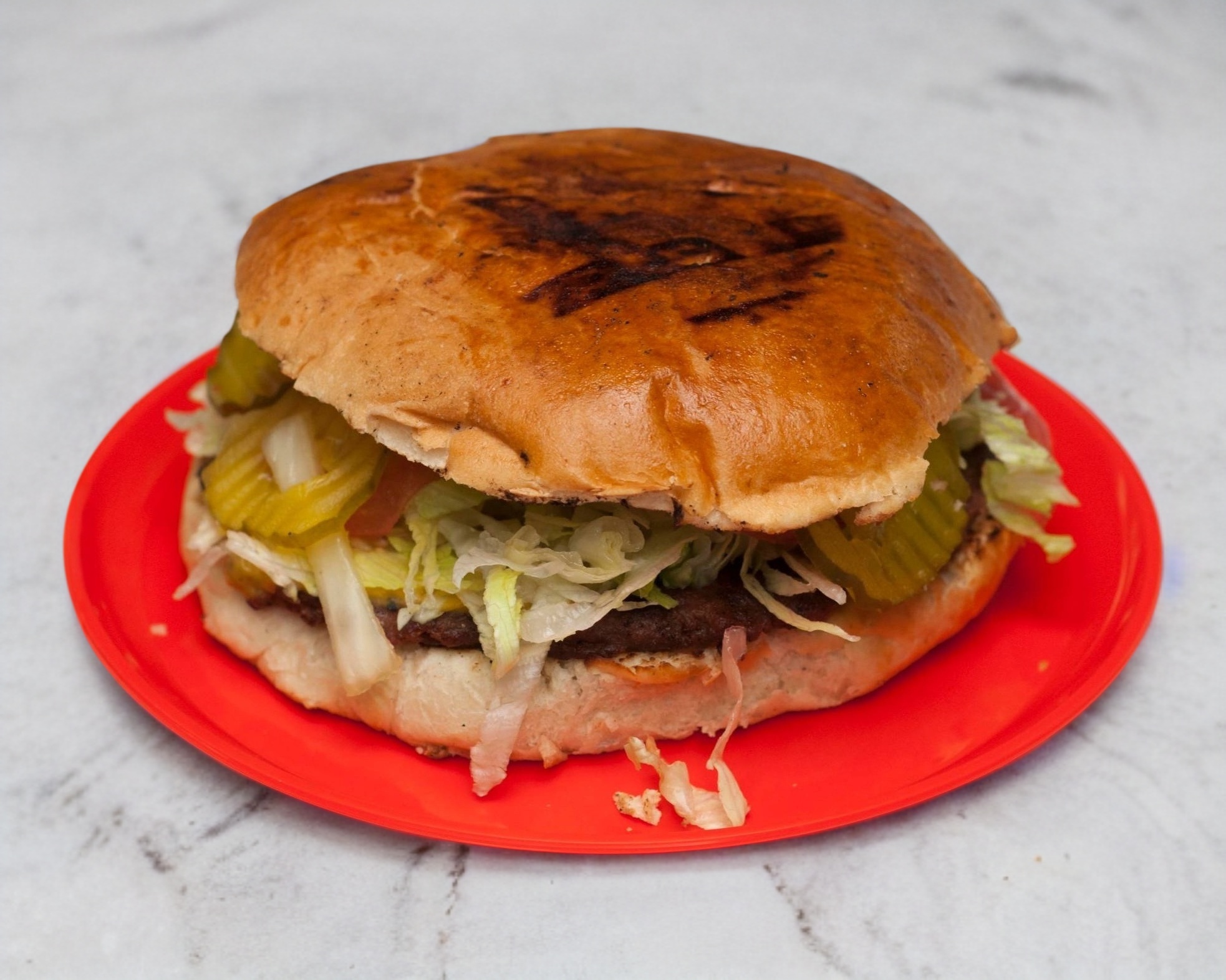 Hamburguesa de pollo sabor grillo, con mayonesa, lechuga, pepinillo, cebolla y aderezo raanch.