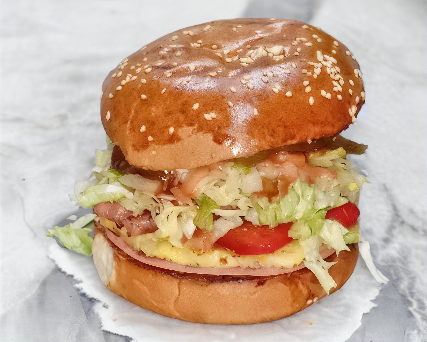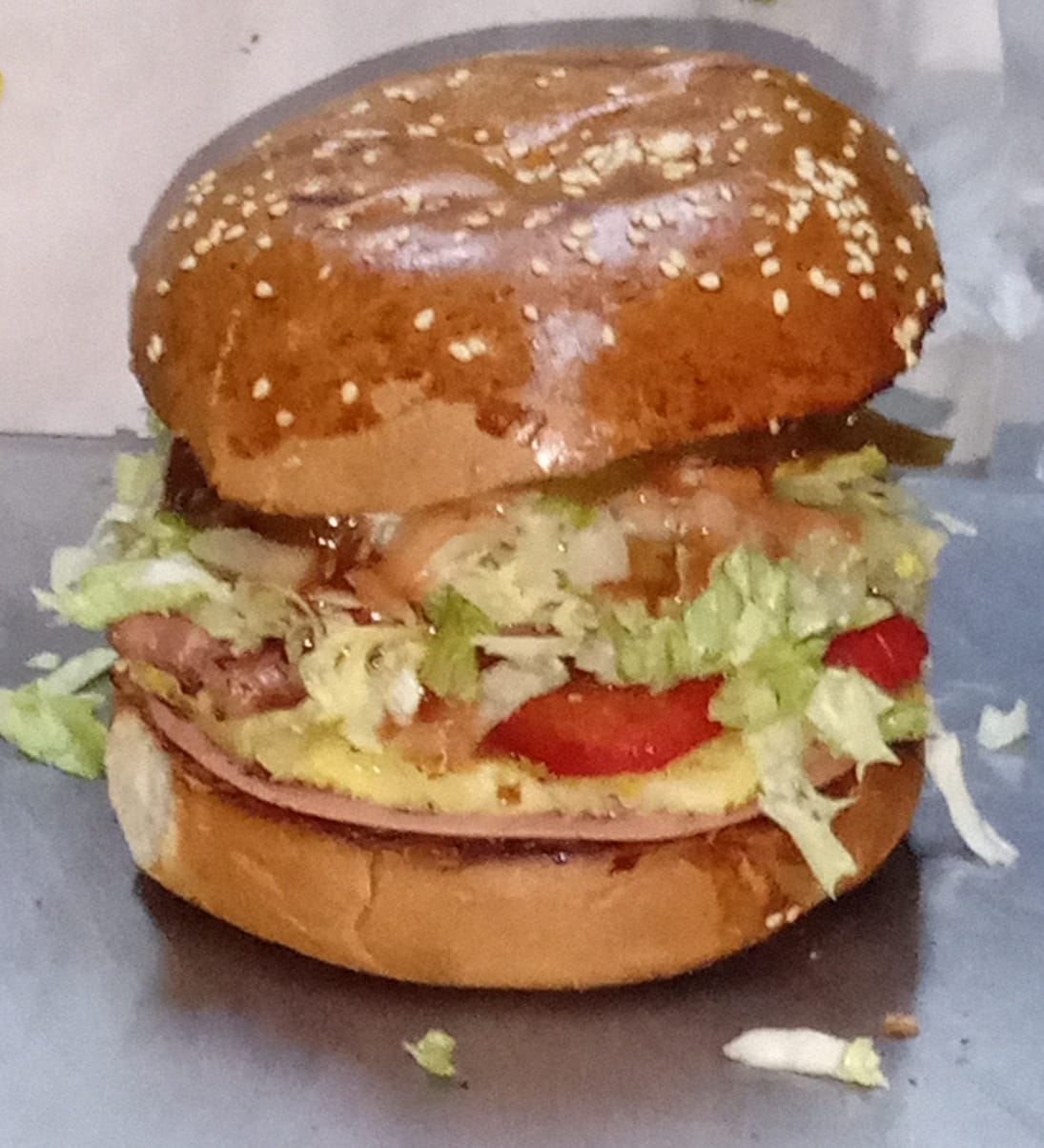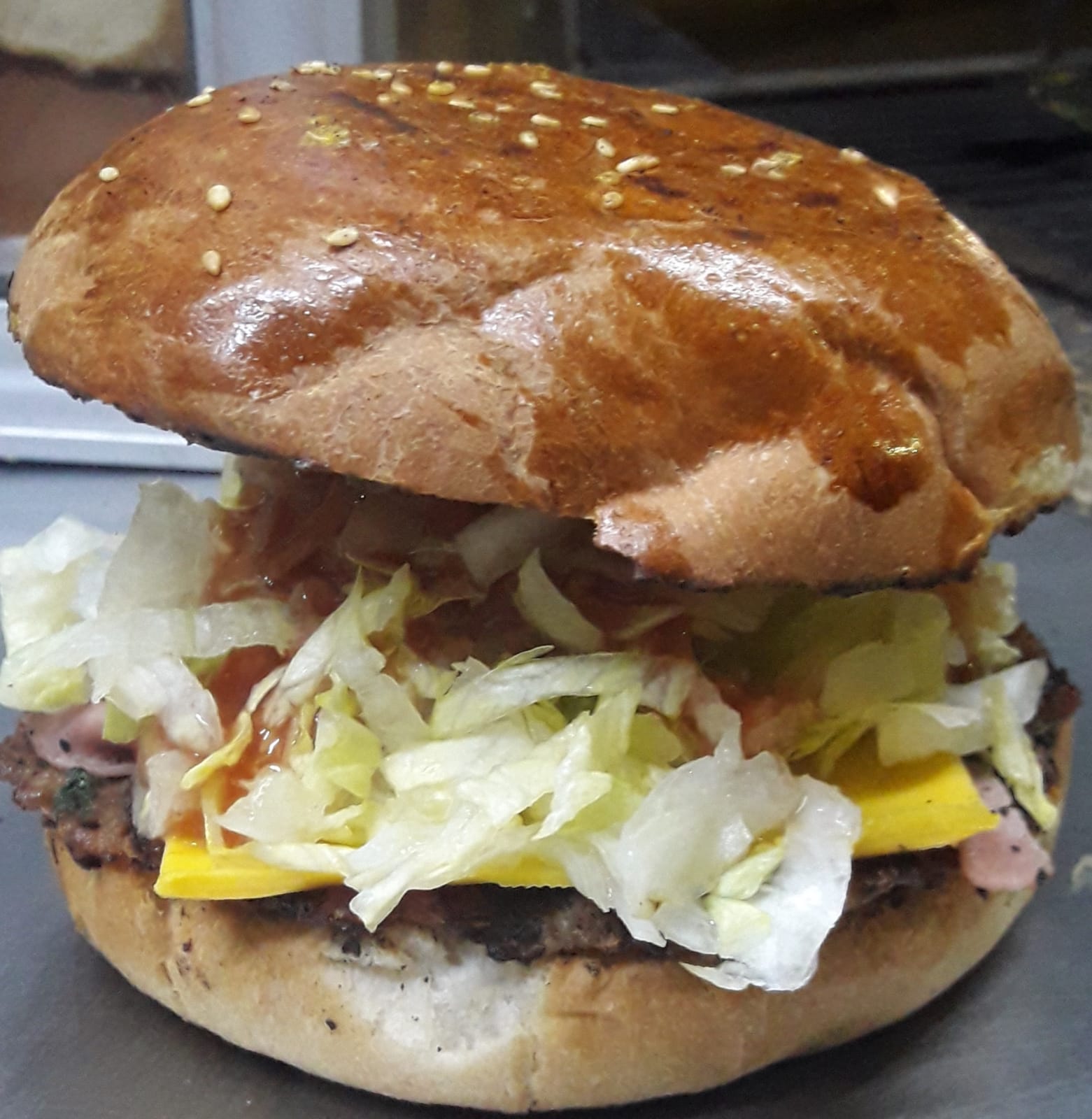 Carne 100% casera de res, jamón, queso americano, tocino y salsa BBQ, lechuga, cebolla y aderezos.