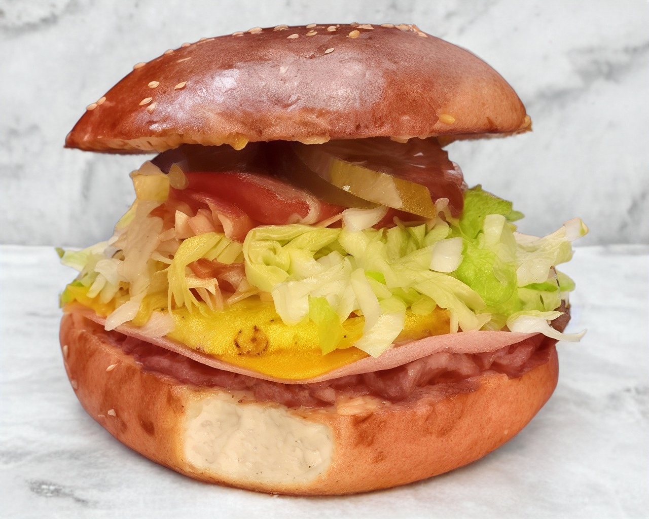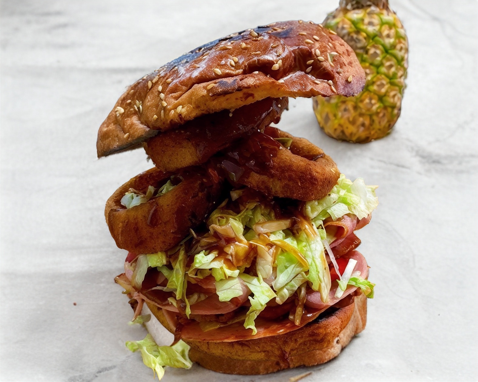 Doble carne 100% casera de res, doble jamón, doble queso americano, 4 tiras de tocino, 2 aros de cebolla, salsa a elegir, BBQ, BBQ habanero o mango habanero.