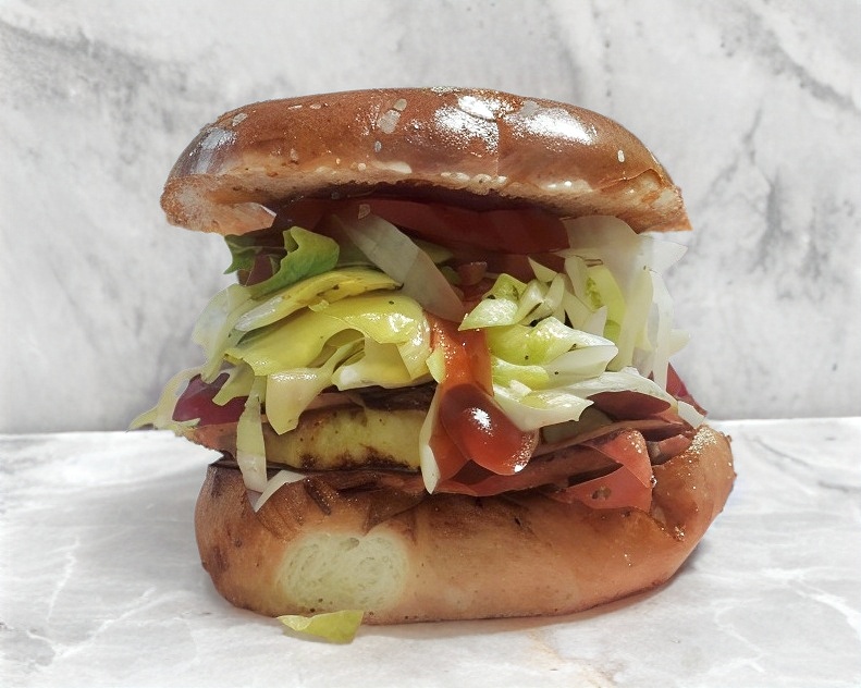 Doble carne 100% casera de res, jamón, queso americano, aguacate, tocino, salchicha para asar y piña, lechuga, tomate, cebolla y chile.