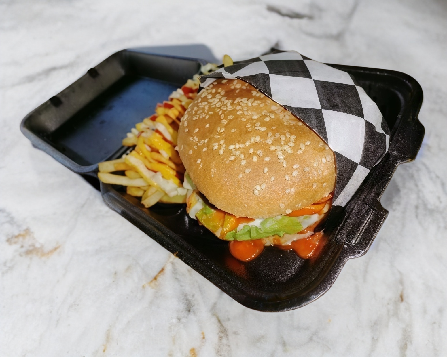 Carne 100% casera de res, jamón, queso americano, tocino y salsa BBQ habanero, lechuga y cebolla.