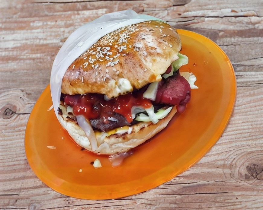 Pan con carne preparada 160 gramos de res , con salchicha asada, queso, jamón, aguacate, cabolla sazonada, mayonesa, mostaza y cátsup.