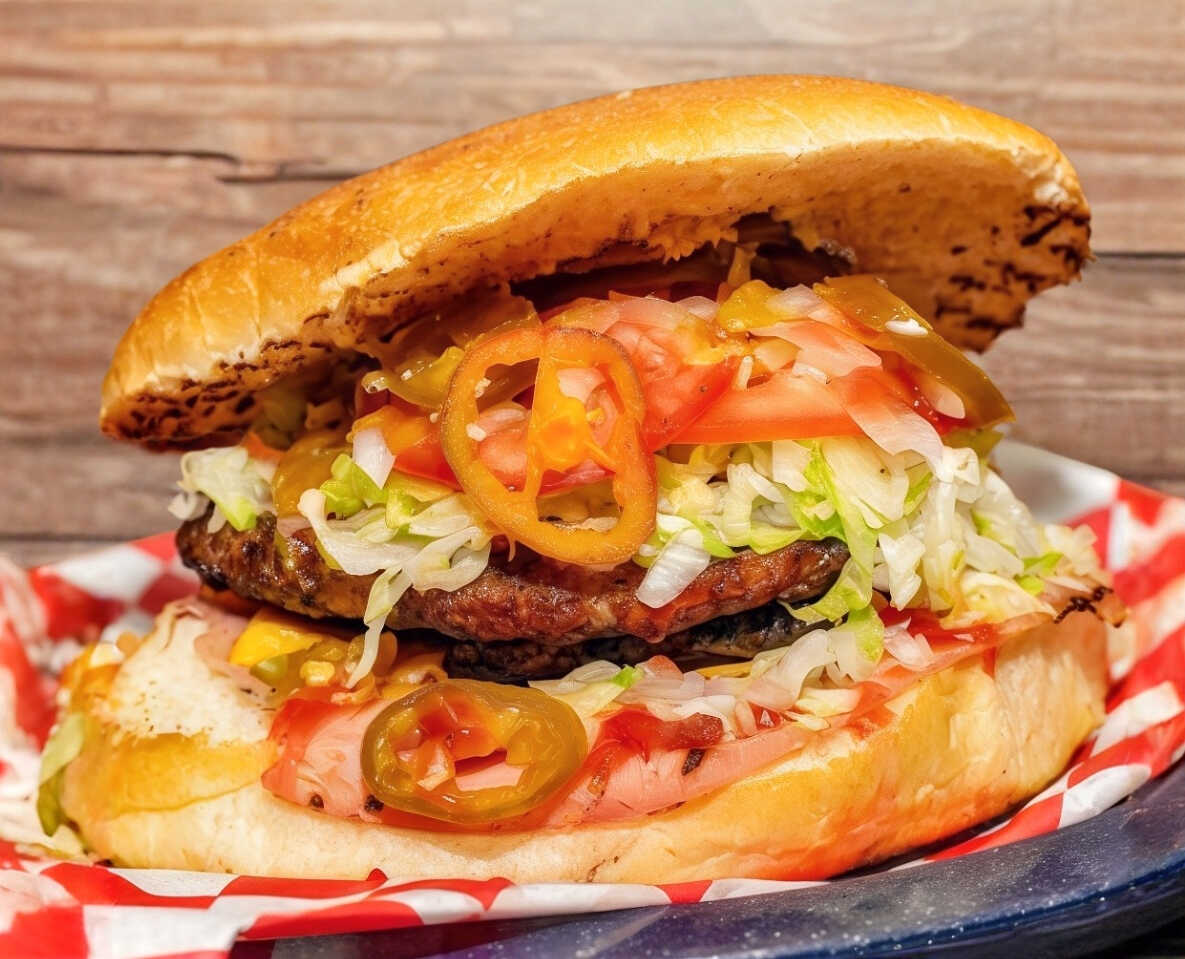 Dos carnes especiales de la casa, queso amarillo, jamón y tocino.