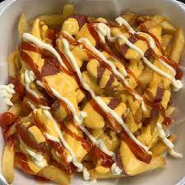 Papas ala francesa bañadas con queso tipo nacho, aderezo ranch, bbq, salsa mango ahabanero