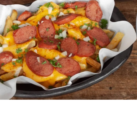 Salchicha de pavo con papas bañadas de queso tipo nacho y asadero