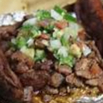 papas a la francesa preparadas con catsup, wacamole en pico de gallo, aderezo queso, carne de arrachera