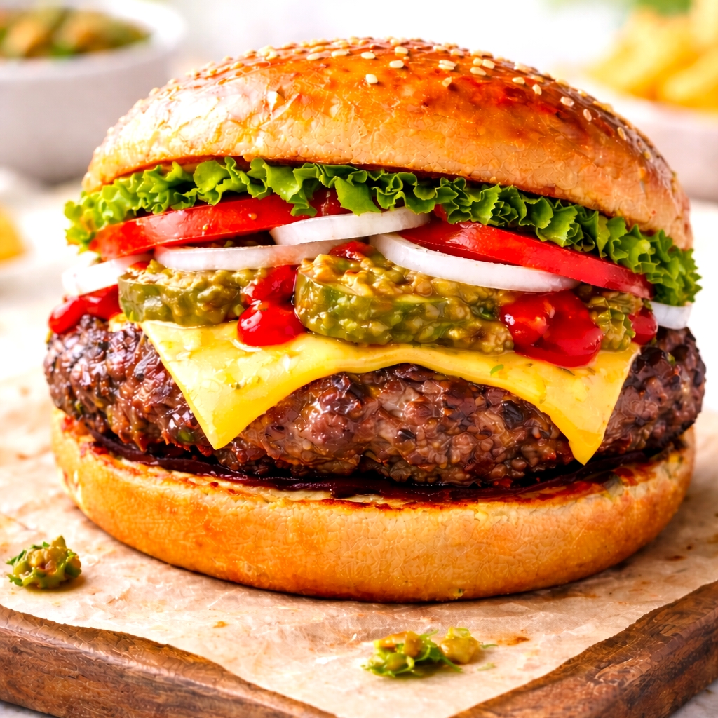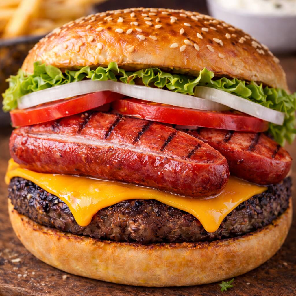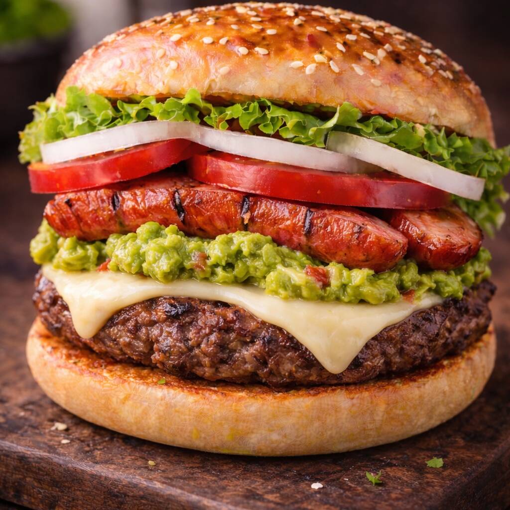 Carne, Queso Amarillo, Tocino, Lechuga, Cebolla, Tomate, Catsup y Chile