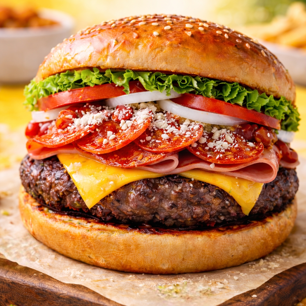 Carne,Queso Amarillo, Tocino, Pepperoni, Queso Parmesano, Lechuga, Cebolla, Tomate, Catsup y Chile