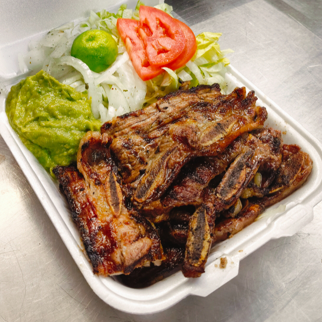 Costilla, Lechuga, Cebolla, Tomate, Aguacate, Salsa y Tortillas