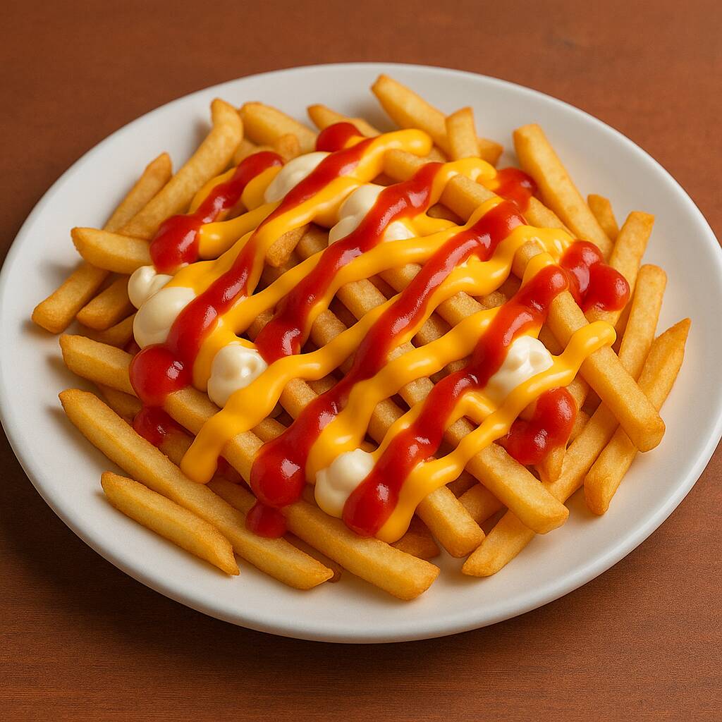 Papas francesas, crema, cátsup, queso amarillo.