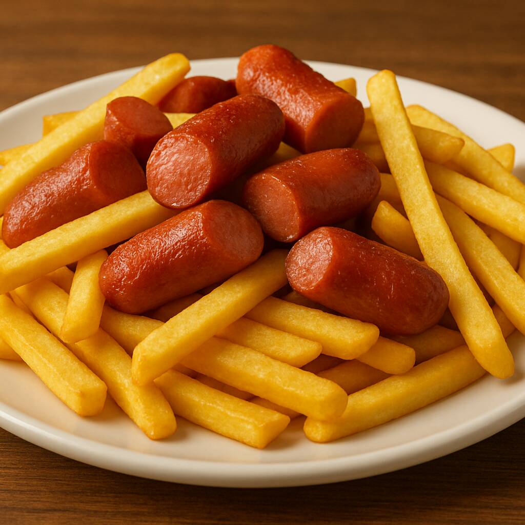 Trocitos de salchicha con papas a la francesa, crema, cátsup, queso amarillo.